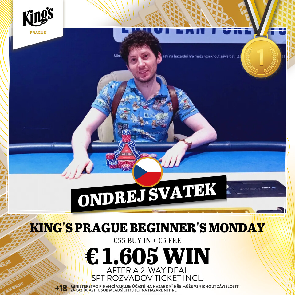 Im King’s Casino Prag wurde gestern natürlich auch gepokert. Hier gab es das €60 King’s Prague Beginner’s Monday mit einer €6k Garantie und zwei SPT Rozvadov Tickets inklusive. Auch hier wurde die Garantie knapp verfehlt, denn es kam nur zu 96 Anmeldungen. Elf Spieler wurden bezahlt und in einem Heads-up Deal erhielt der Tscheche Ondrej Svatek letztendlich mit €1.605 einen Euro mehr als der Italiener Adriana Cracchiolo und war somit der offizielle Sieger des Turniers.