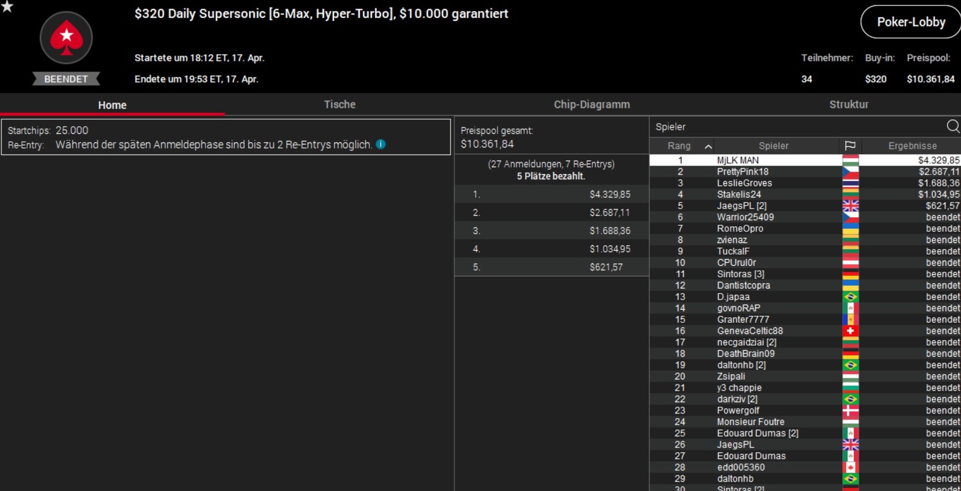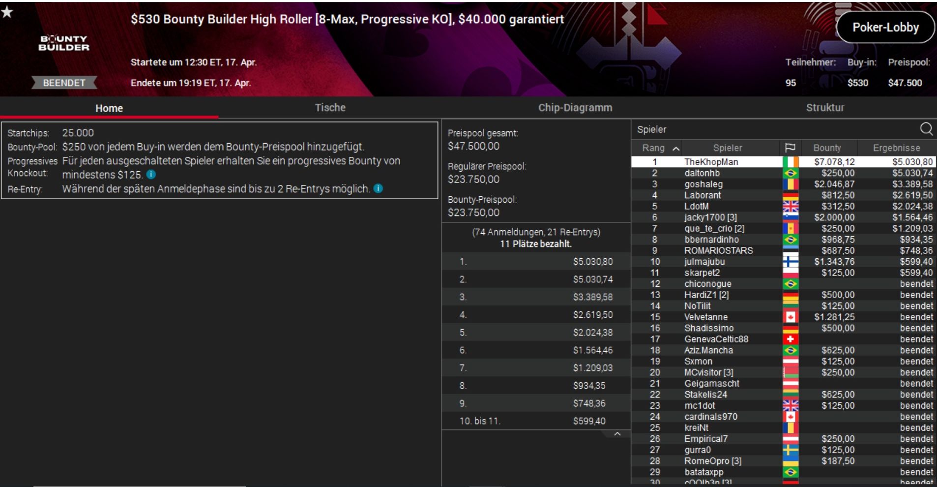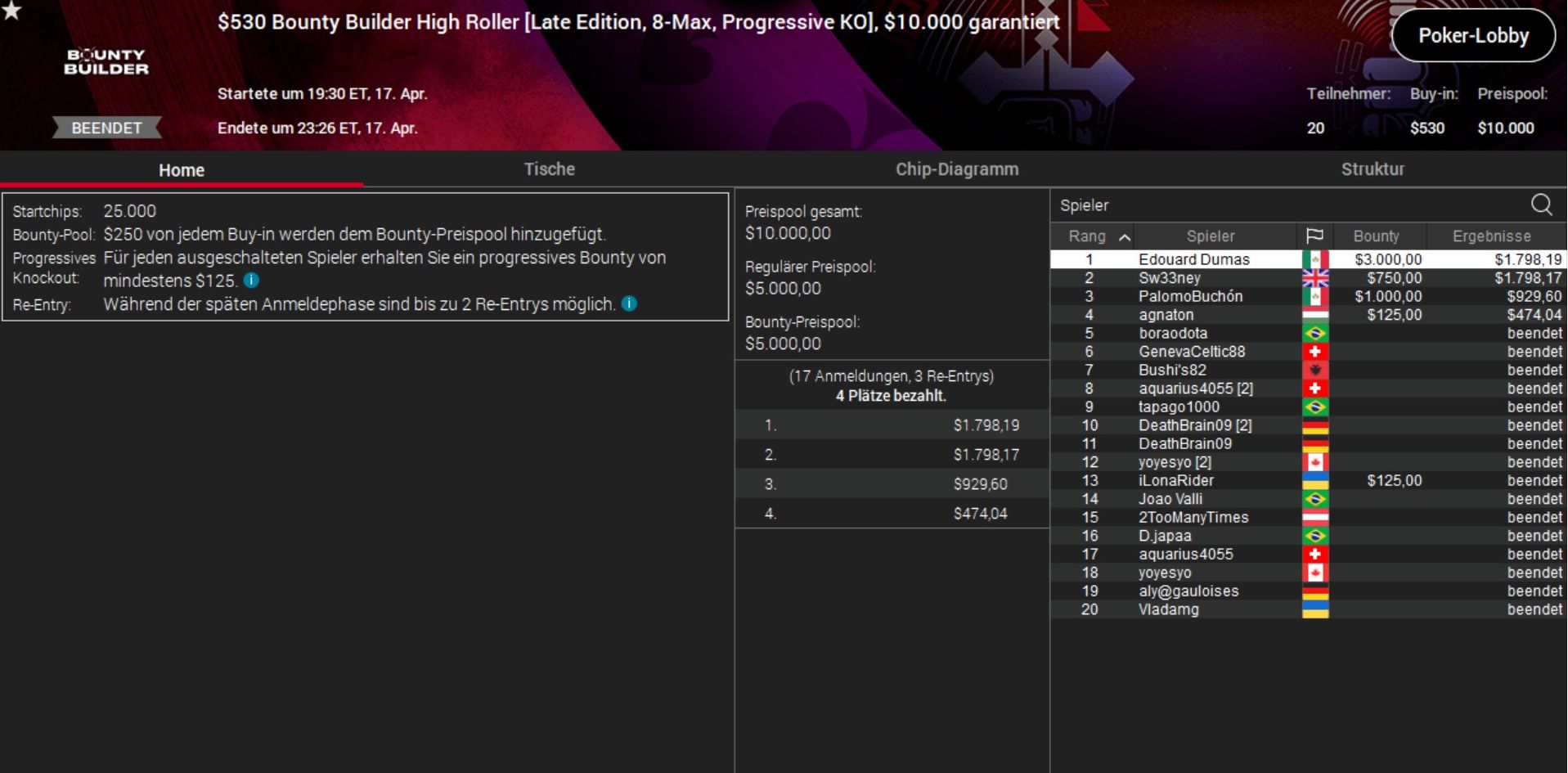 Auf den Plätzen 2 und 3 kamen „Old brock“ und „Lundisgsund“, beide aus Österreich, ins Ziel. Einziger Wermutstropfen: „Shadissimo“ aus Deutschland verpasste als Bubble Boy die Preisgeldränge und musste sich mit $250 Bounty-Prämien begnügen.