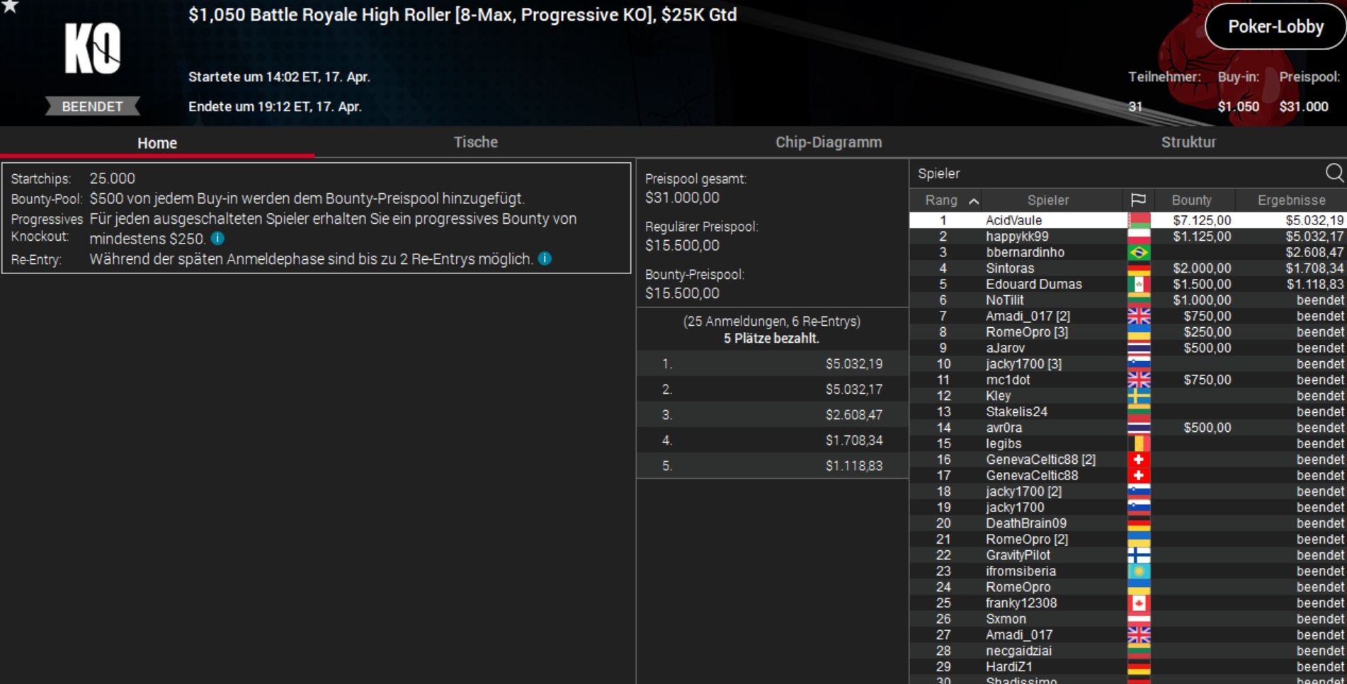 Größter Gewinner des Tages war „AcidVaule“ aus Belarus, der für seinen Sieg beim $1.050 Battle Royale über $12.000 abräumte.
