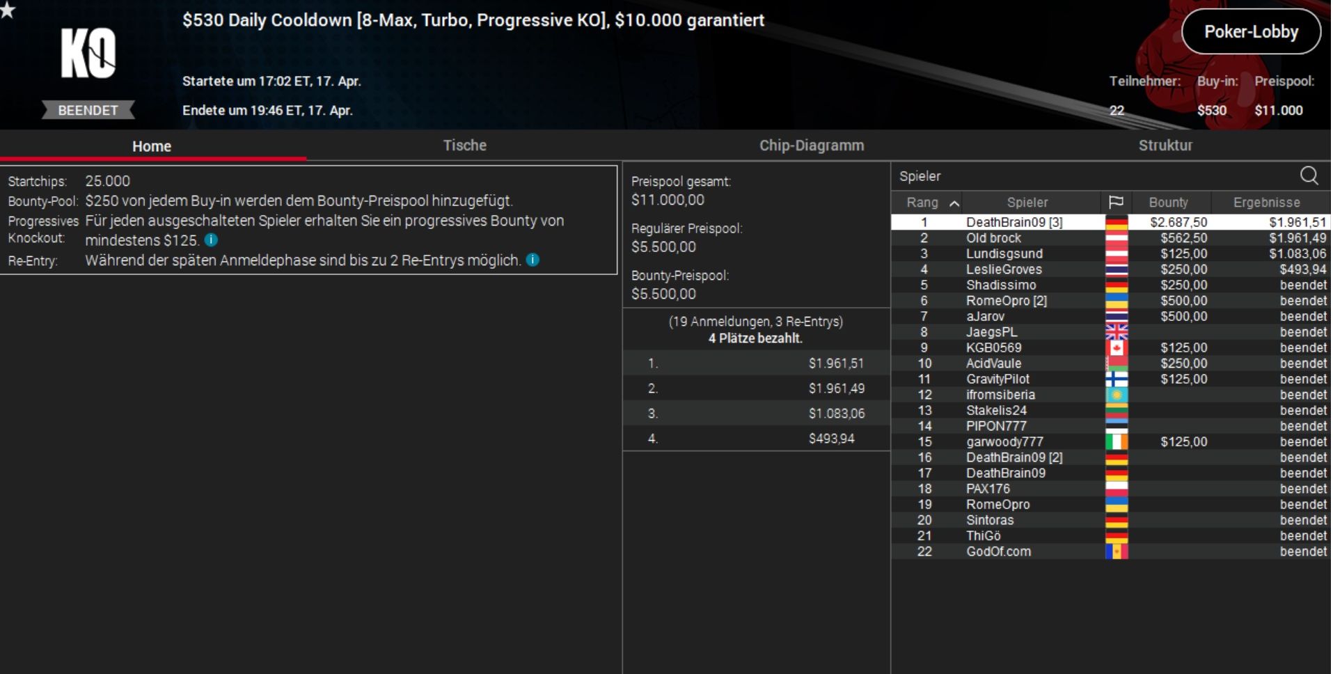 Den Sieg unter 22 Teilnehmern holte der Deutsche „DeathBrain09“, dessen drei Buy-Ins sich mit einem Preisgeld von über $4.600 locker auszahlten.