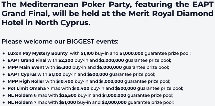 Sonne, Meer, Poker – das sind die Zutaten der Mediterranean Poker Party (MPP) Cyprus powered by Merit Poker. Vom 1. bis 12. Mai wird das Poker Festival als Grand Final der EA Poker Tour (EAPT) im Merit Royal Diamond and Spa auf Zypern stattfinden. Dabei gab und gibt es für über 250 Spieler*innen die Möglichkeit sich online für das $5.300 Main Event zu qualifizieren. Allein $5 Millionen sind in dem M.E. (7. bis 12. Mai) an Preisgeld garantiert. – Und für all diejenigen, die mit dickerer Geldbörse anriesen, gibt jetzt auch ein eigenes High Roller Schedule mit 6 Turnieren!