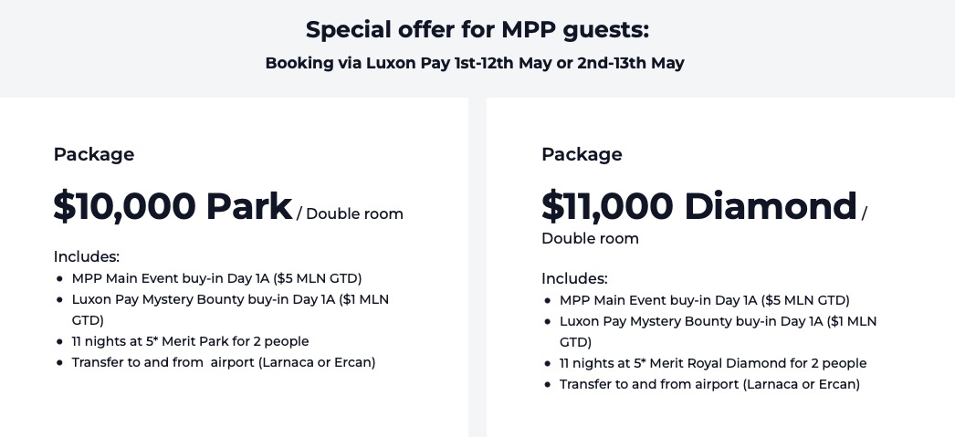 Die $10.000 „Online Flight to MPP“ Packages beinhalten das Buy-In sowohl für das $5.300 Main Event, als auch für das $2.200 $2M Guarenteed Tournament. Weiter sind 8 Nächte Luxus-Unterkunft für 2 Personen im Merit Crystal Cove oder Merit Park enthalten. Außerdem beinhaltet es den Transfer von und nach Larnaca oder Ercan. Schließlich sind auch noch $500 Spesen mit dabei.