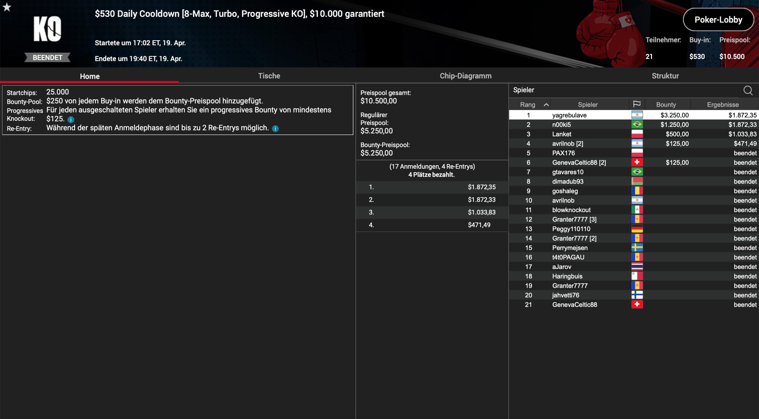 Im $530 Daily Cooldown wurde die $10k-Garantie mit 21 Teilnahmen haarscharf geknackt. Es siegte nach 2,5 Stunden Spielzeit „yagrebulave“ aus Argentinien für $5.122.