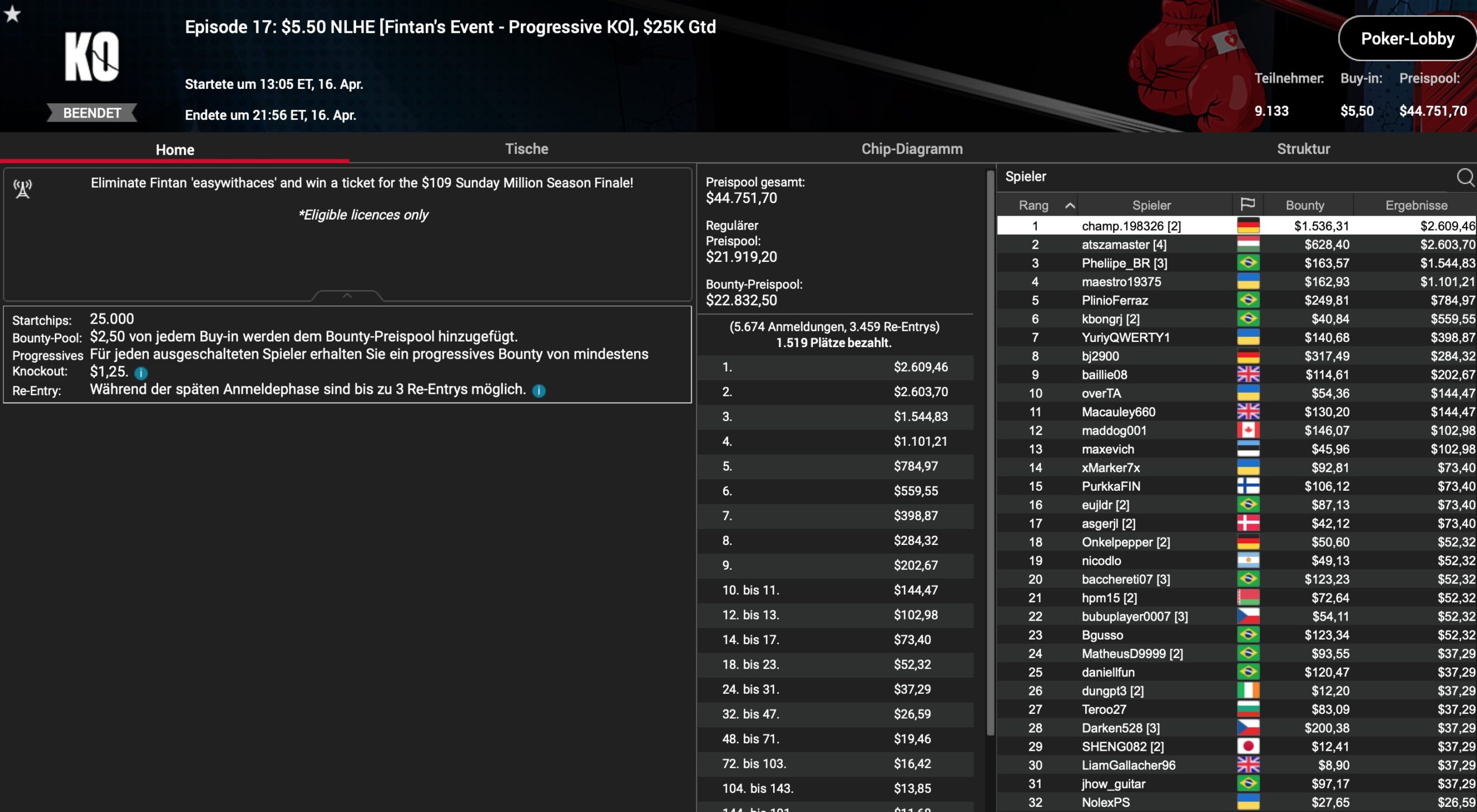 In Episode 16, dem $5,50 NLHE (Fintans Event) krachte es direkt für die D-A-CH-Community: Unter 9.133 Total Entries war es am Ende „champ198326“ aus Deutschland, der nach 9 Stunden Spielzeit erst alle Chips des Turniers und im Anschluss $4.145 Preisgeld besaß. Sein Landsmann „bj2900“ landete für $601 als 8. ebenfall am Final Table.