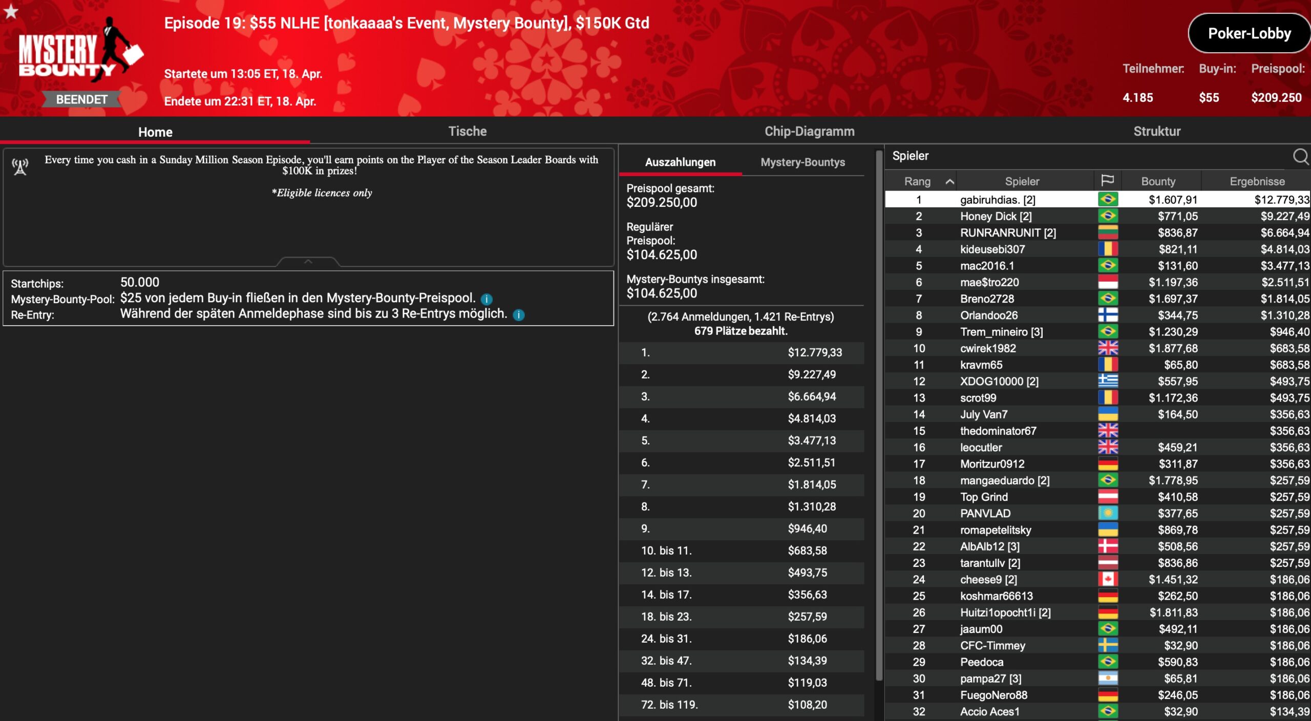 In Episode 24 waren 793 Total Entries (585+208) am Start, darunter jede Menge bekannte Namen. Kein Wunder war es doch zum einen das Event von PokerStars-Legende Lex Veldhuis, und zum anderen mit $215 Startgeld eher etwas für die bekannten High Roller Regs. Gleich 4 D-A-CH-Vertreter schafften es an den Finaltisch des NLHE Mystery Bounty Event: „StevoGasic“ aus der Schweiz wurde für $5.442 am Ende 9., auf Rang 6 landete „JustTrappedU“ für $3.164, „Edelschimmel“ wurde 5. mit einem Payout von $7.026 und für „kostis7227“ war das MTT nach 8 Stunden mit Platz 4 und $6.467 Payout beendet. Der Sieh und ein kombiniertes Payout von $15.620 gingen an „Daddddymufff“ aus Großbritannien.