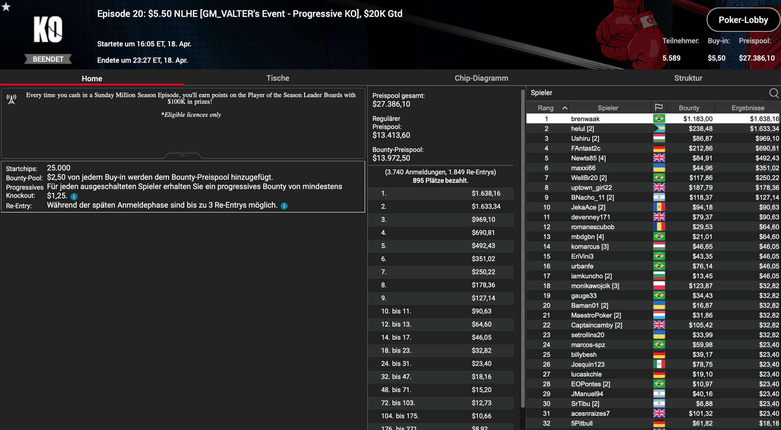 Im letzten HR MTT des Tages, der Late Edition vom $530 Bounty Builder, war gar kein D-A-CH-Spieler mit von der Partie. Der Sieg und die $4.915 Siegprämie gingen hier unter 18 Teilnehmern und bei $1.000 Overlay nach 3,5 Stunden an „leonidus1988“ aus Kasachstan.