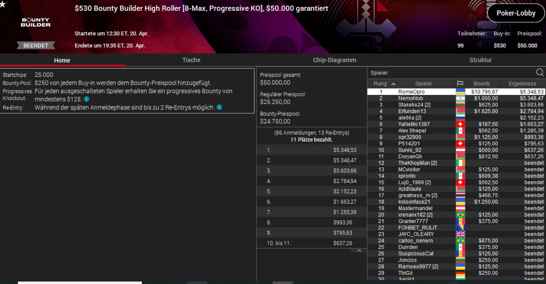 Größter Gewinner am Samstag aber war der Ukrainer Roman „RomeOpro“ Romanovskyi, der für seinen Sieg beim $530 Bounty Builder über $16.000 Preisgeld in Empfang nehmen durfte.