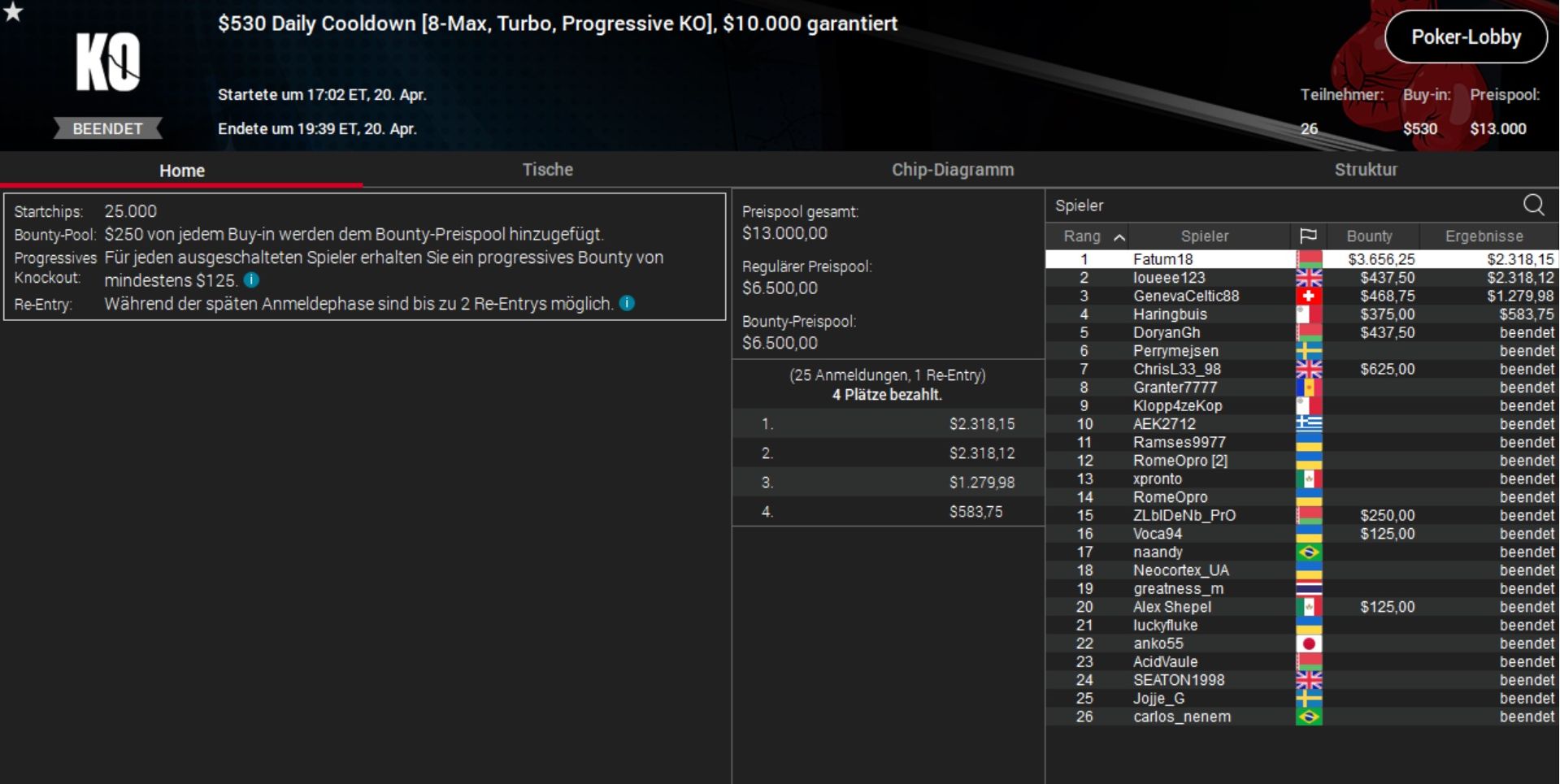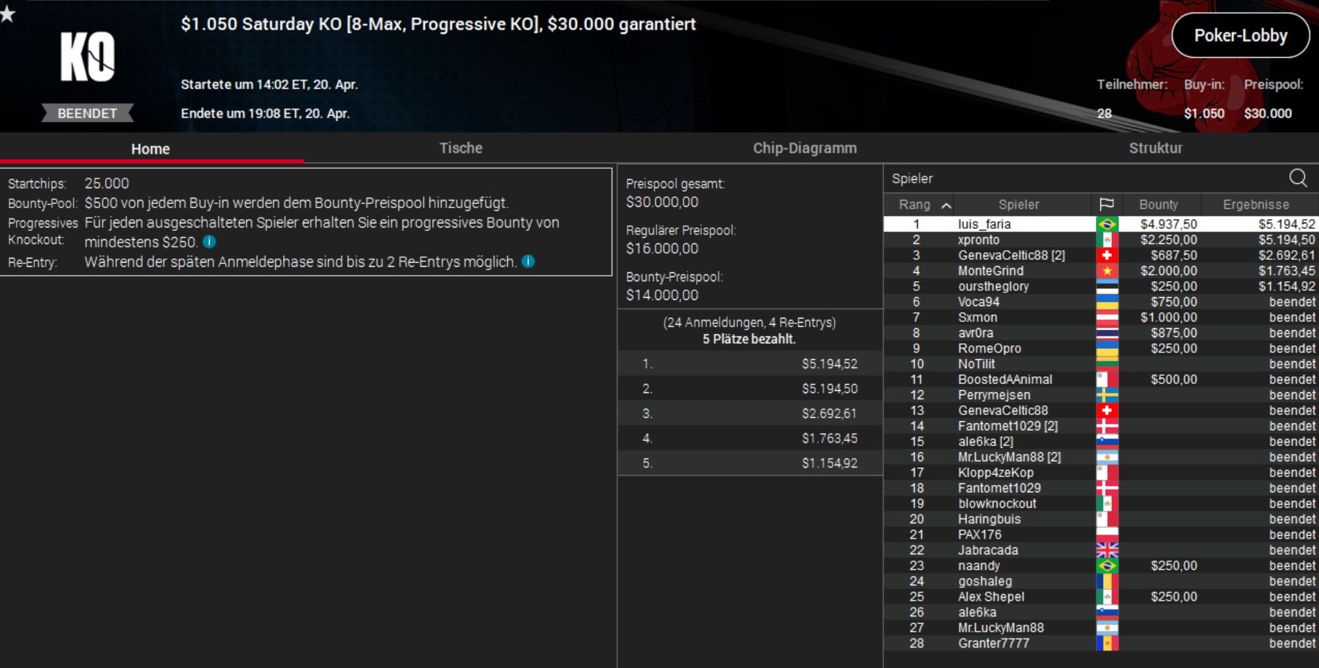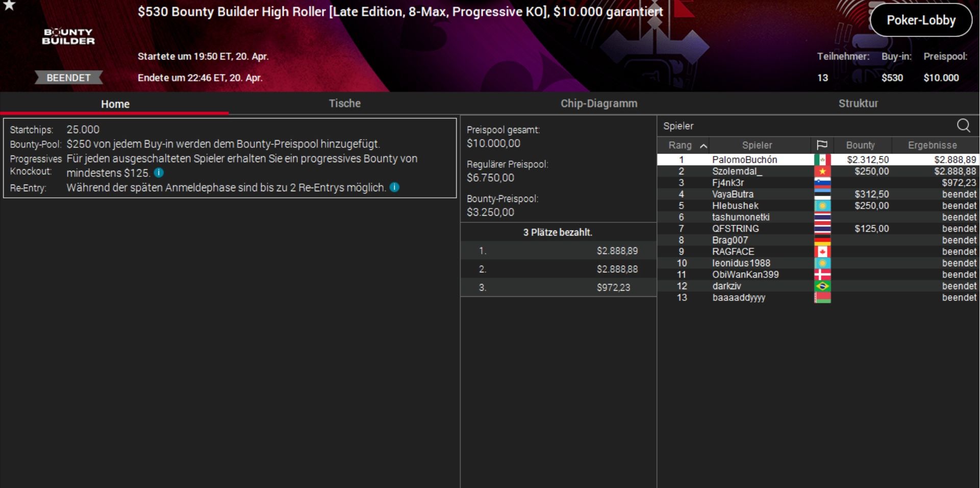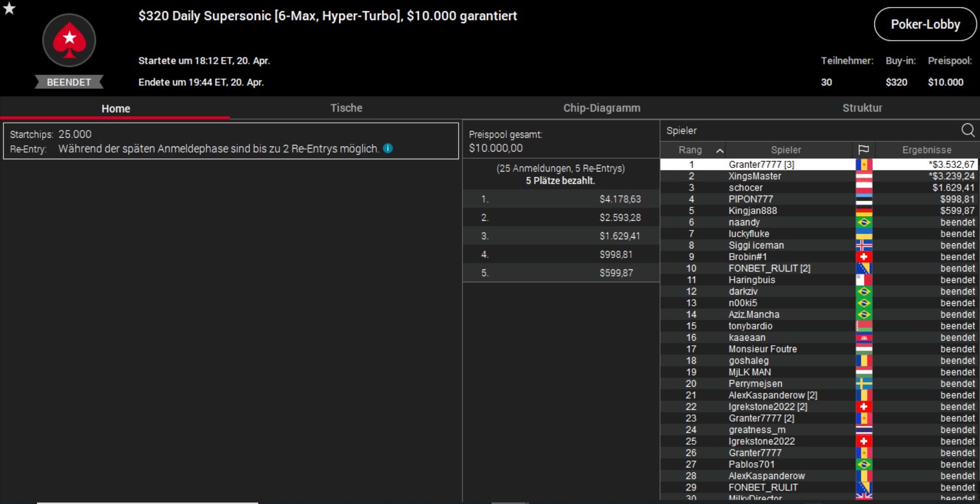 Das beste DACH-Ergebnis aber erzielte „XingsMaster“ aus Österreich. Er ´machte beim $320 Supersonic nach gut 90 Minuten einen Deal mit „Granter7777“ aus Andorra und schnappte sich gut $3.200 Preisgeld.