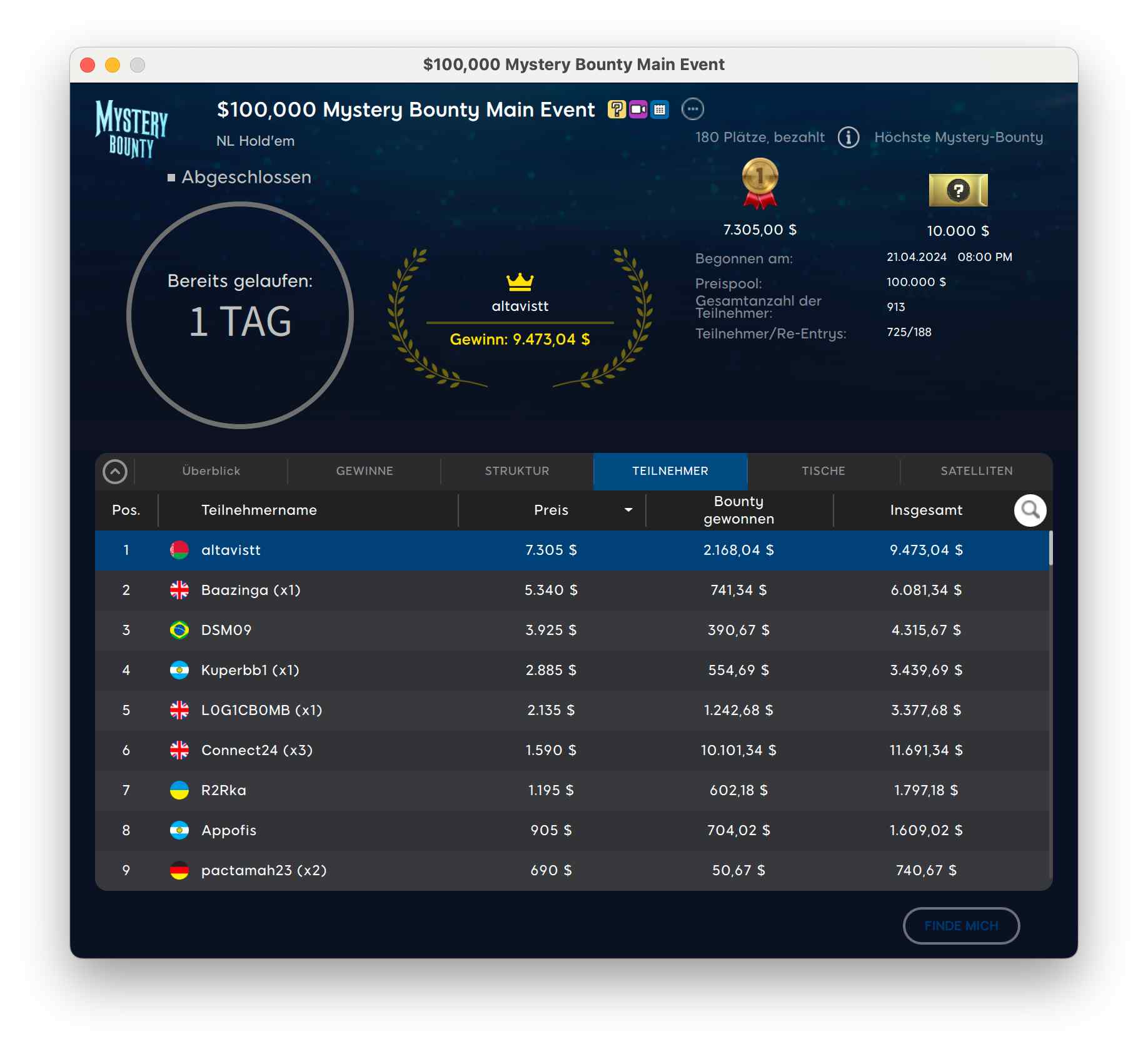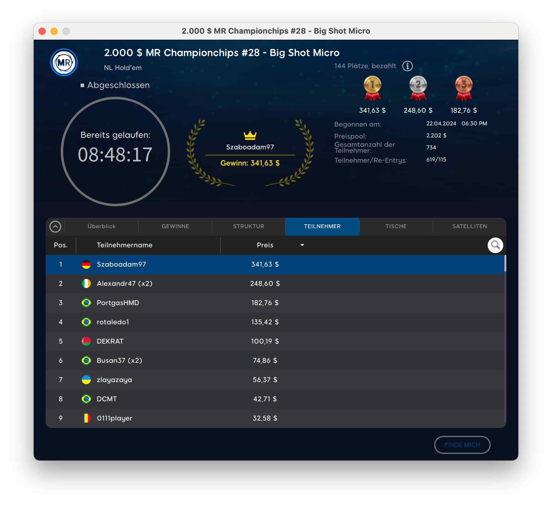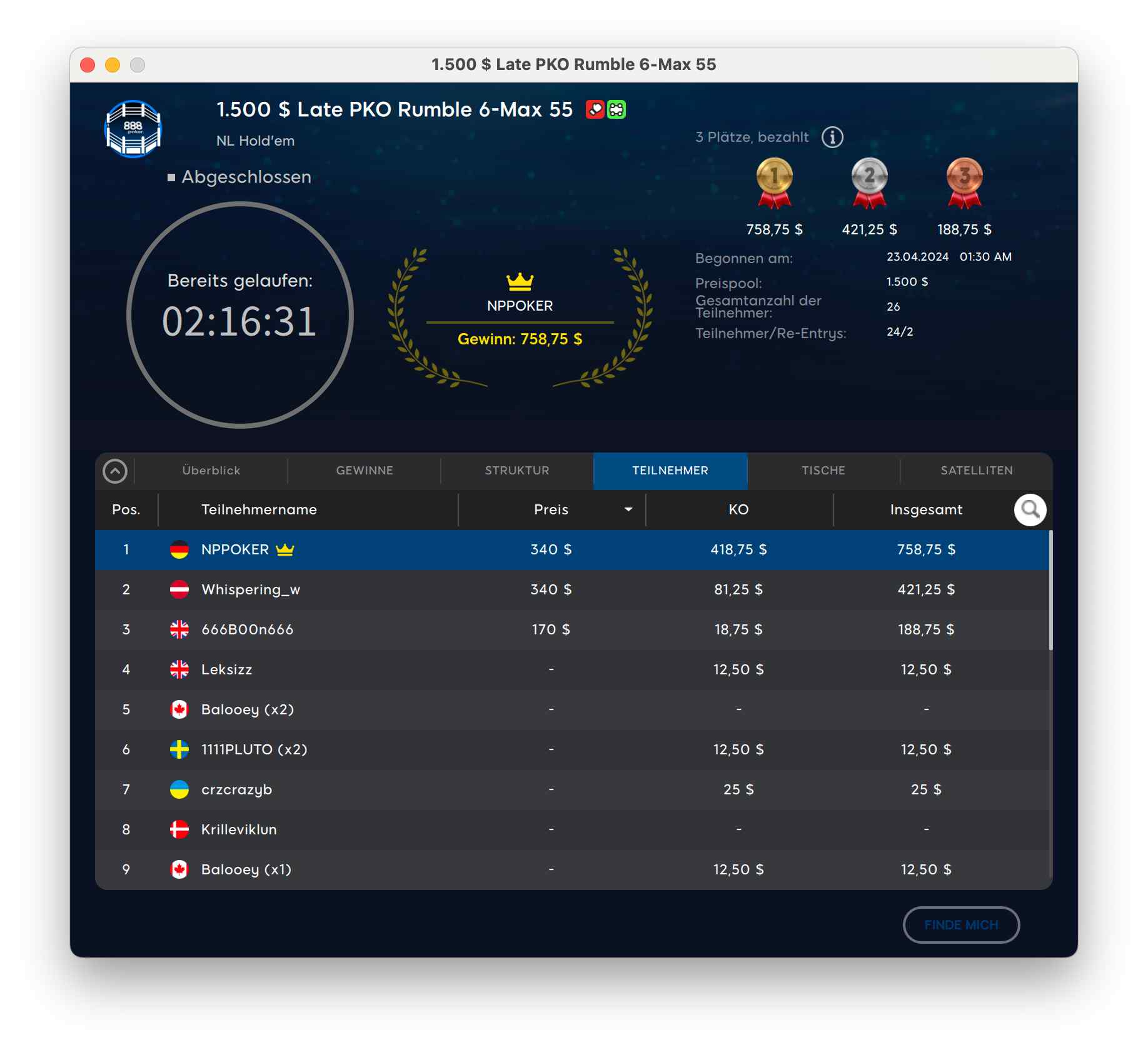Zwei deutsche Spieler konnten Turniere gewinnen. „NPPOKER“ gewann $340 + $418 im $1.500 Late PKO Rumble 6max, „Szaboadam97“ siegte im $2.000 MR Championchips Big Shot Micro für $341.