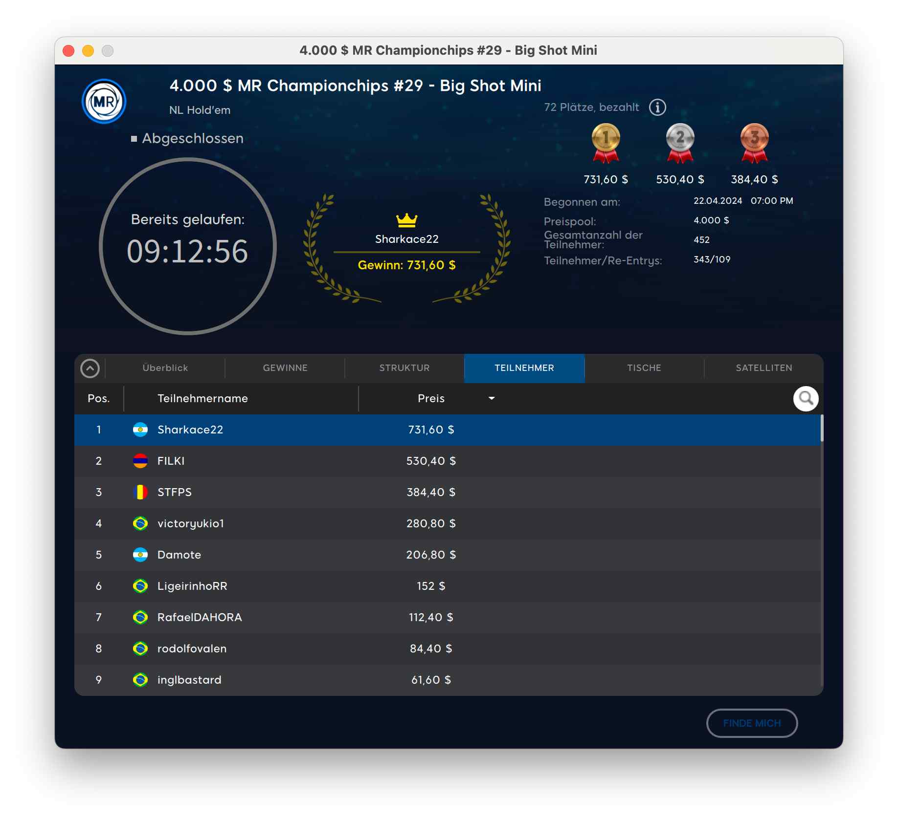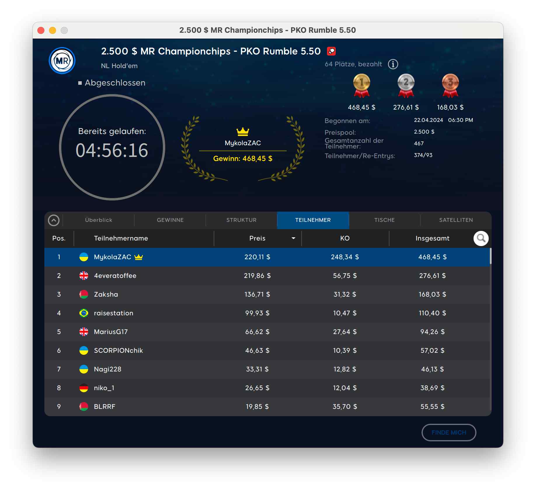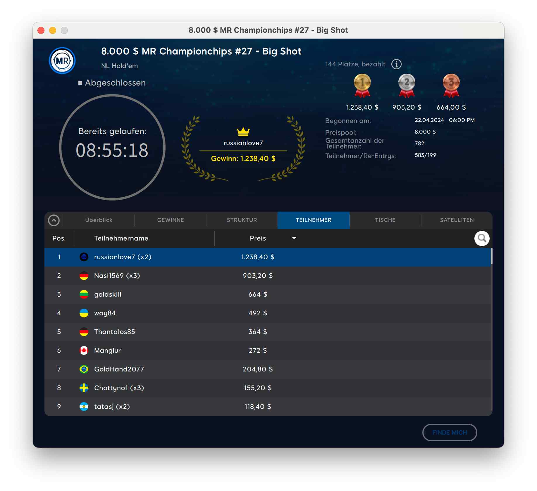Zwei deutsche Spieler konnten Turniere gewinnen. „NPPOKER“ gewann $340 + $418 im $1.500 Late PKO Rumble 6max, „Szaboadam97“ siegte im $2.000 MR Championchips Big Shot Micro für $341.