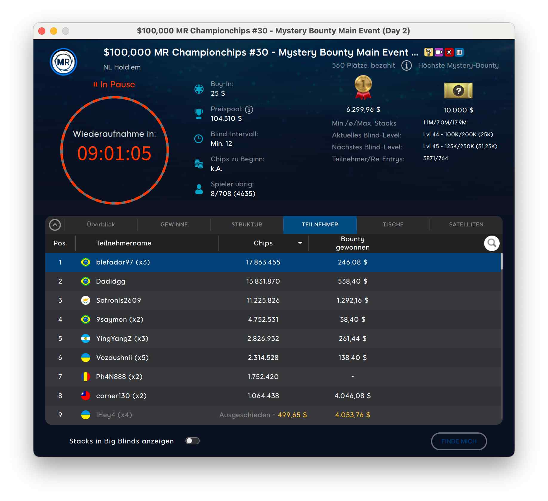 Beim $100.000 MR Championchips Mystery Bounty Main Event sind noch acht Spieler von 708 übrig, die in Tag 2 einstiegen. Der Brasilianer „blefador97“ führt mit 17,87 Mio. Chips – $246 an Bounties hat er schon eingesammelt. Kein DACH-Spieler mehr ist im Rennen.