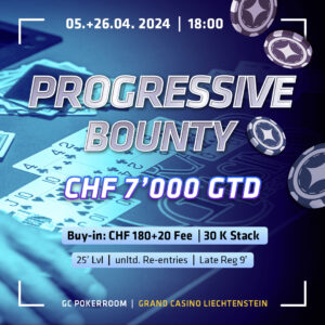 Heute geht es im Grand Casino Liechtenstein weiter mit einem CHF 200 Progressive Bounty. Das Turnier startet um 18:00 Uhr mit 30.000 Chips. Gespielt wird mit 25-Minuten Blinds und es gibt einen garantierten Preispool von CHF 7.000.
