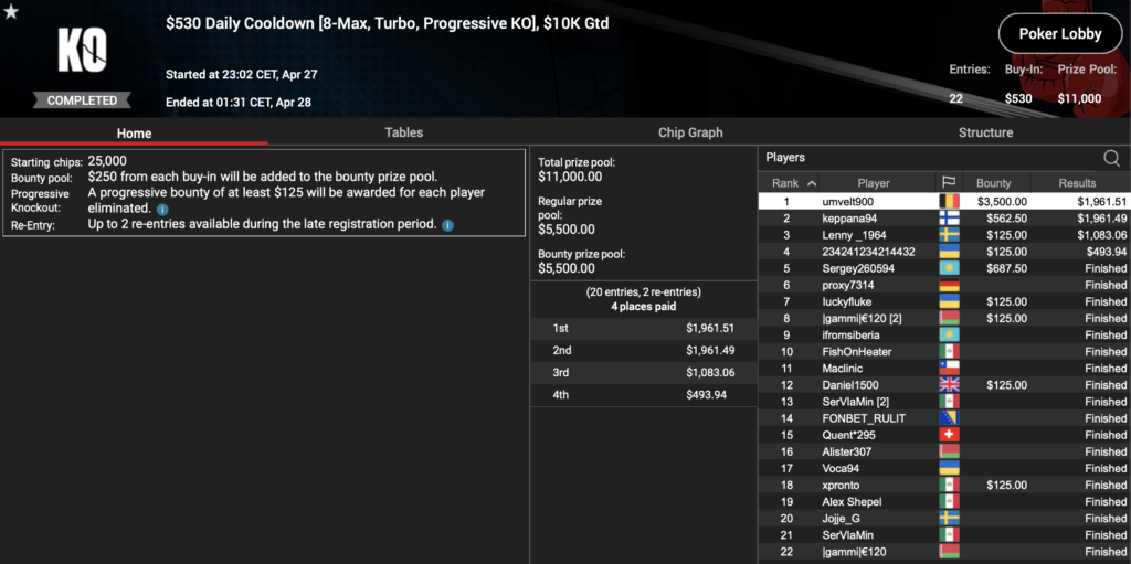 Und zu guter Letzt hatten wir das $530 Daily Cooldown High Roller mit einer $10k Garantie. Insgesamt 22 Entries kamen hierfür zusammen und schufen so einen Preispool von $11.000. Ganz oben auf dem Siegertreppchen stand am Ende ‚umvelt900‚ aus Belgien. Dieser konnte sich über $1.961 und $3.500 an Bounties freuen.