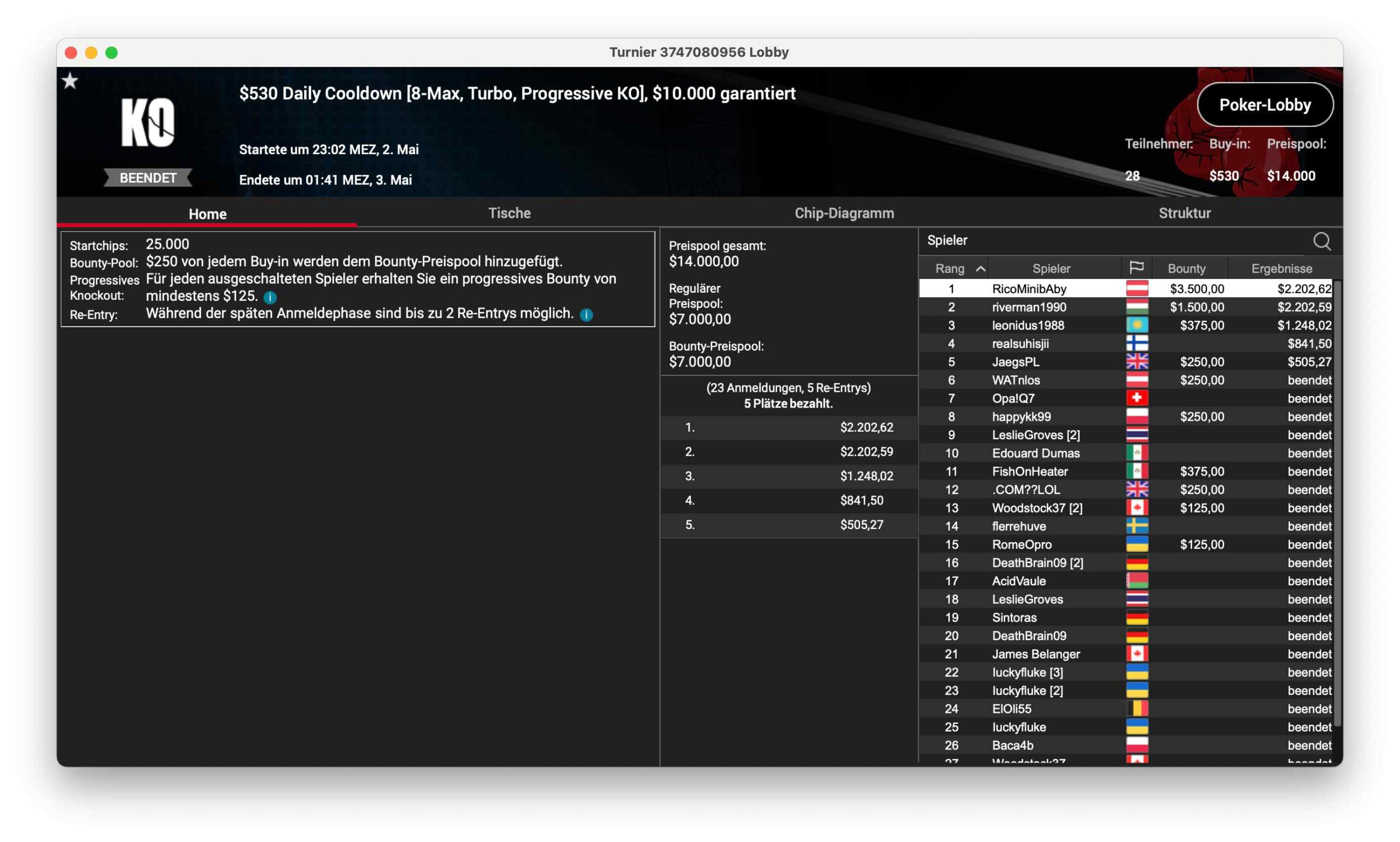 Beim $530 Daily Cooldown kamen 28 Entries zustande, $14.000 kamen so im Preispool zusammen. „RicoMiniAby“ aus Österreich konnte es gewinnen und $3.500 + $2.202 aus dem Turnier mitnehmen.