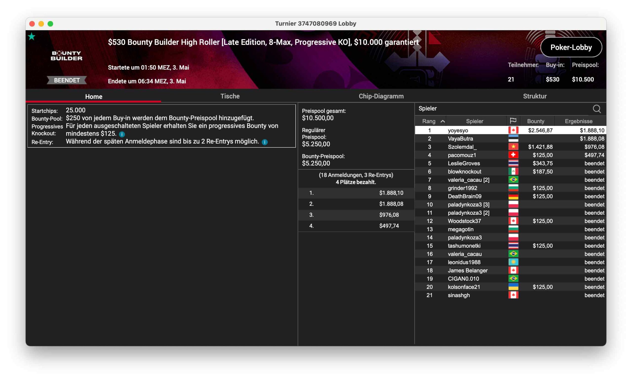 Die Spätausgabe hatte 21 Entries und einen $10.500 Preispool. Der Kanadier „yoyesyo“ spielte sich an die Spitze und wurde damit mit $2.546 + $1.888 belohnt.