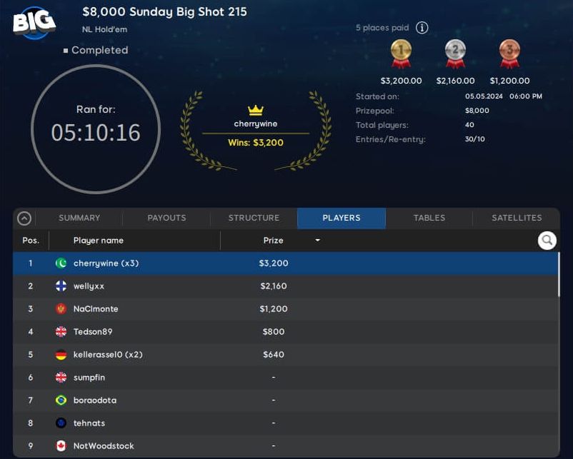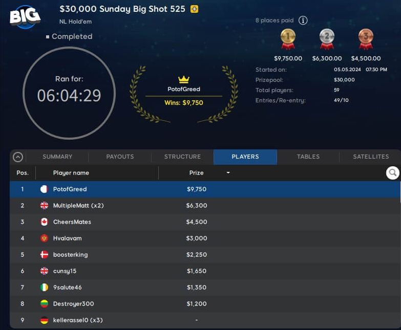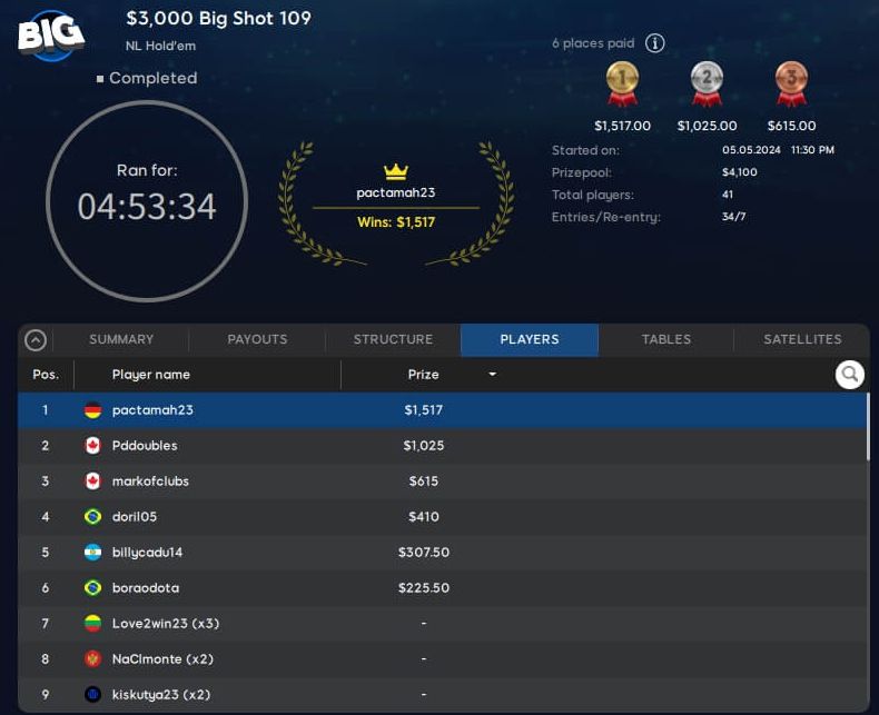Zwei Siege für die DACH-Community gab es aber doch noch. Beim $109 Big Shot triumphierte „pactamah23“ und nahm ein Preisgeld von $1.517 in Empfang, während „khk19622“ beim $3.50 Micro Rollers Main Event 2.779 Konkurrenten besiegte und sich über $1.114,46 freuen durfte.