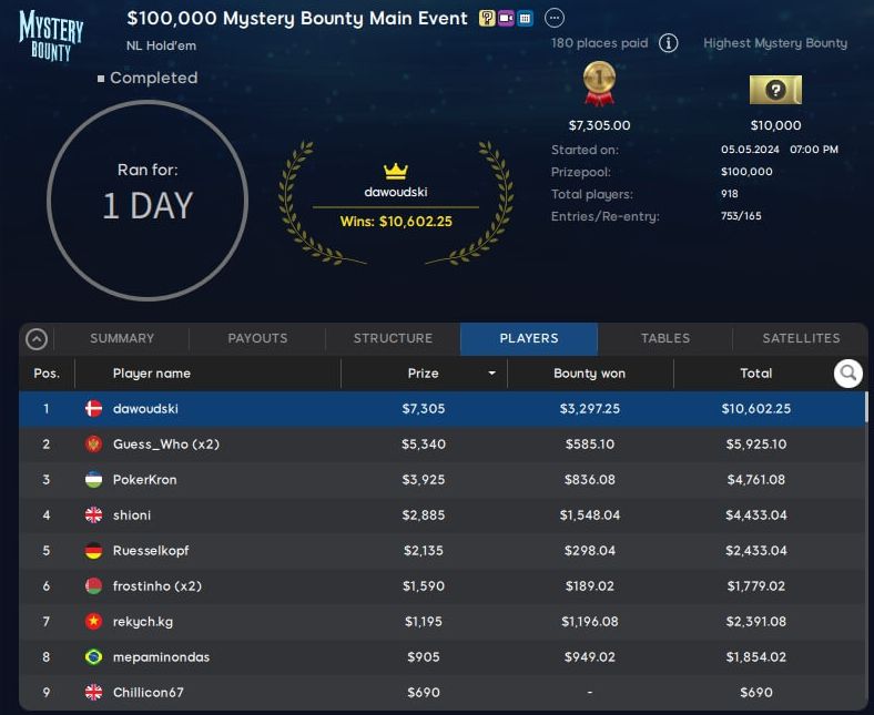 Dieses Mal bezahlten 918 (753+165) Entrys das Startgeld von $109, womit die Spieler bei einem Preisgeld von $100.000 in den Genuss eines Overlays kamen.