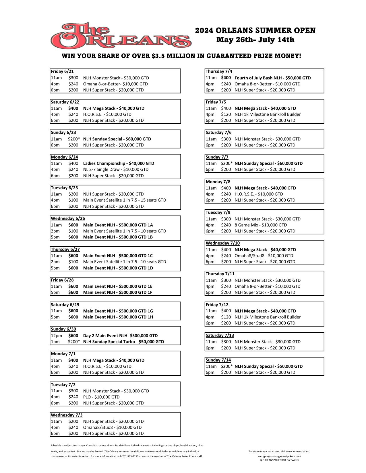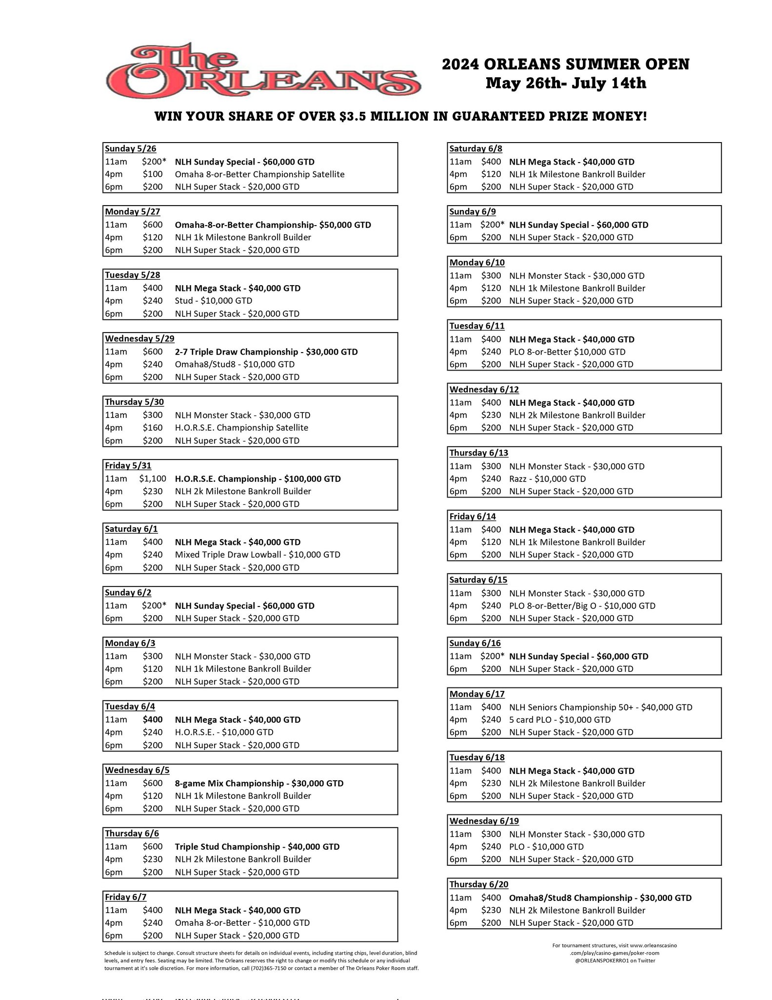 $3,500,000 in guarantees, a $600 buy-in $500,000 GTD Main Event AND $100,000 GTD H.O.R.S.E. event. The Orleans Summer Open schedule incoming! ?