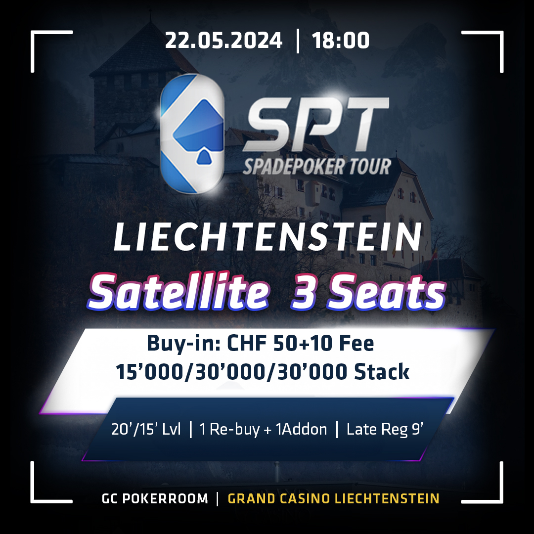 Heute geht es um 18:00 Uhr im Grand Casino Liechtenstein weiter mit einem CHF 60 Satellites zum SpadePoker Tour Main Event im Juni. Das Satellite garantiert drei Tickets.