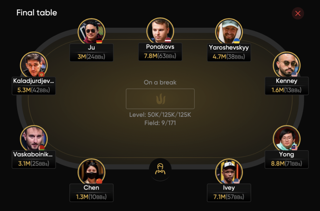 Aus DACH-Sicht haben wir noch einen Vertreter im Rennen mit Samuel Ju, der als Siebter (24BB) in den heutigen Finaltag starten wird. Chipleader ist Wai Kin Yang aus Malaysia (71BB). Besonders hervorzuheben ist, dass die Legende Phil Ivey (57BB) noch mit dabei ist und das als Dritter in Chips. Alle Spieler haben an diesem Punkt $478.000 sicher.