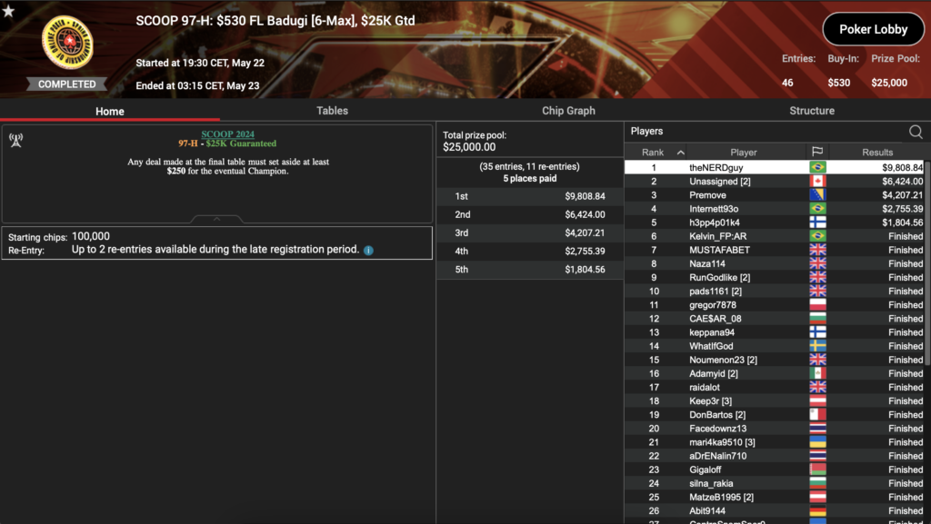 Im SCOOP Edition: Big $109 ($100k GTD) gab es 1.077 Entries und somit einen Preispool von $107.700. Hier konnten wir einen „österreichischen“ Sieg feiern. Bert ‚girafganger7‘ Stevens gewann $16.446.