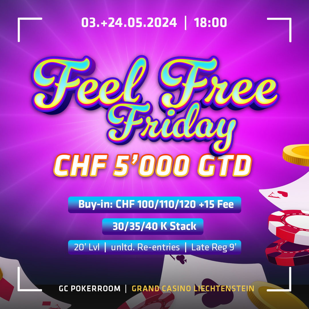 Heute geht es um 18:00 Uhr im Grand Casino Liechtenstein weiter mit dem Feel Free Friday, in dem Buy-ins und somit Start Stacks gewählt werden können. CHF 100 für einen 30k Stack, CHF 110 für einen 35k Stack oder CHF 120 für einen 40k Stack. Das Turnier hat eine CHF 5.000 Garantie und wird gespielt mit 20 Minuten Blinds.