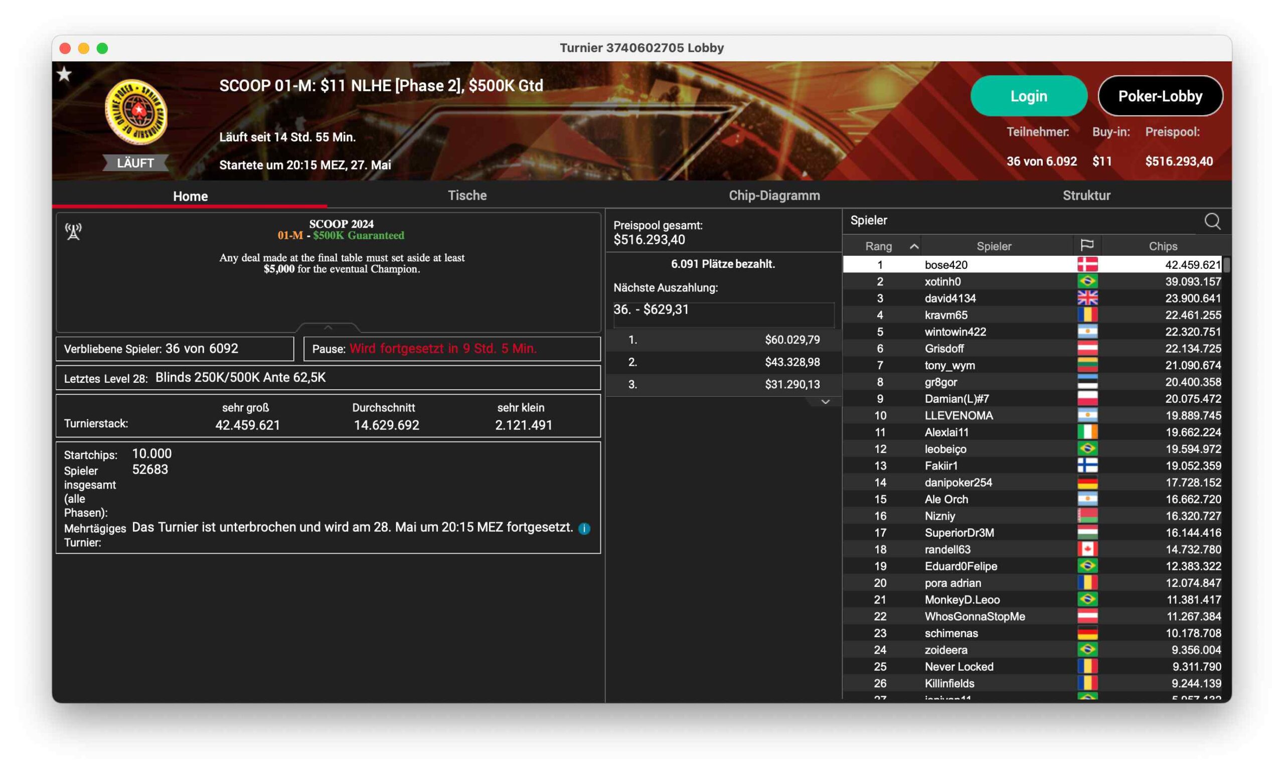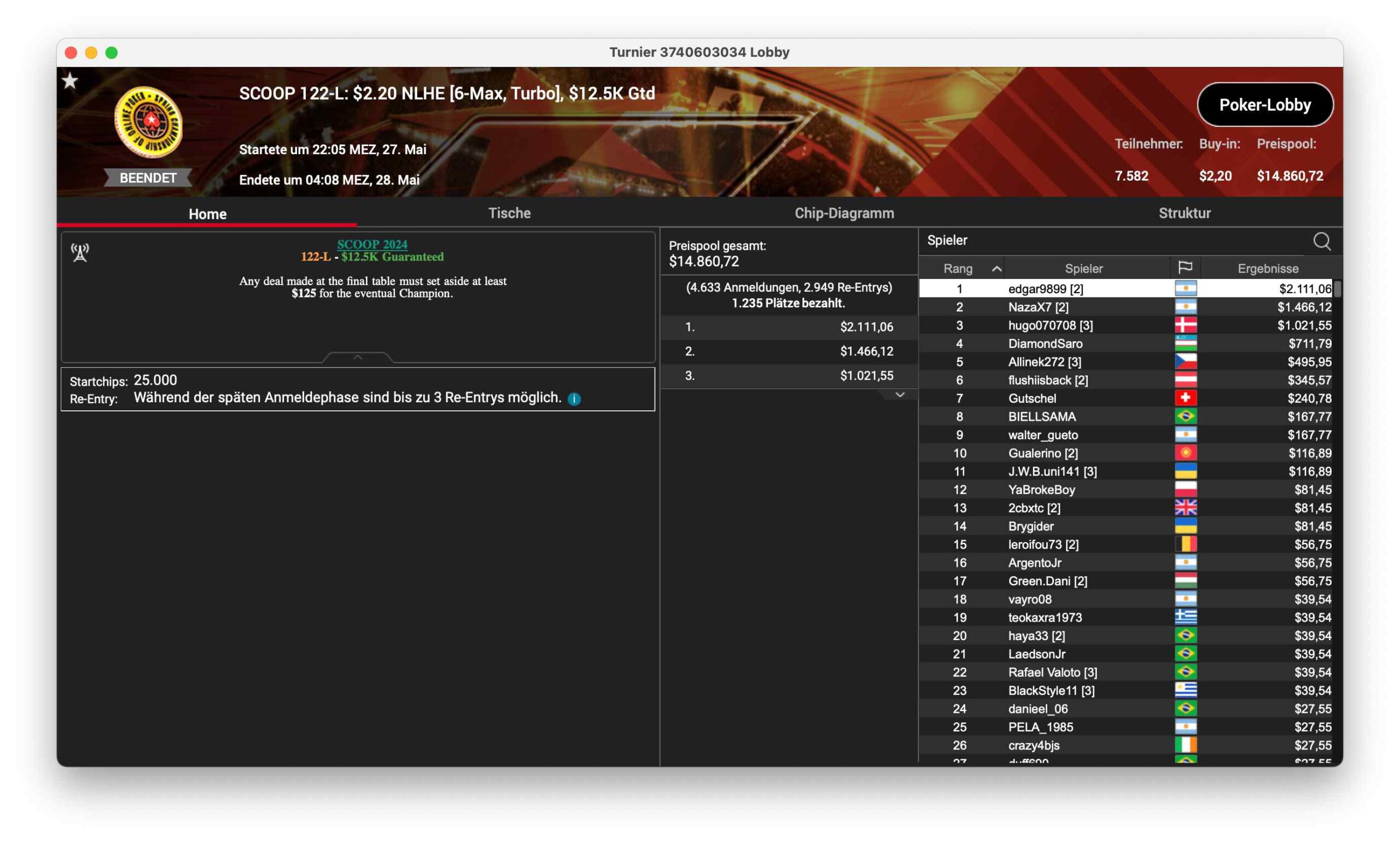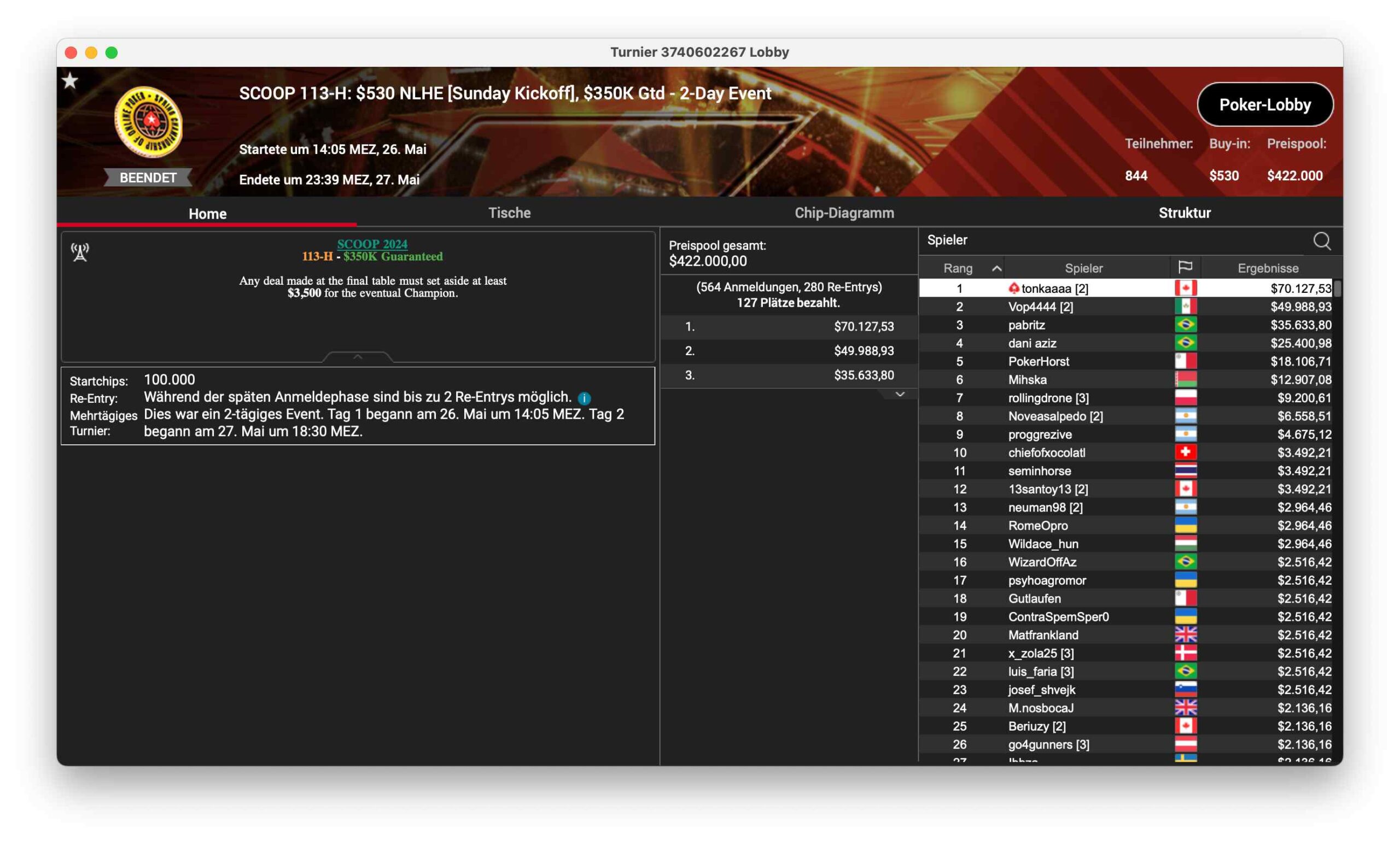 SCOOP 121-M, ein $530 NLHE, Main Event 2nd Chance hatte 699 Runner – $349.500 kamen so im Preispool zusammen. „mohsalah11“ aus Brasilien konnte für $59.499 gewinnen.