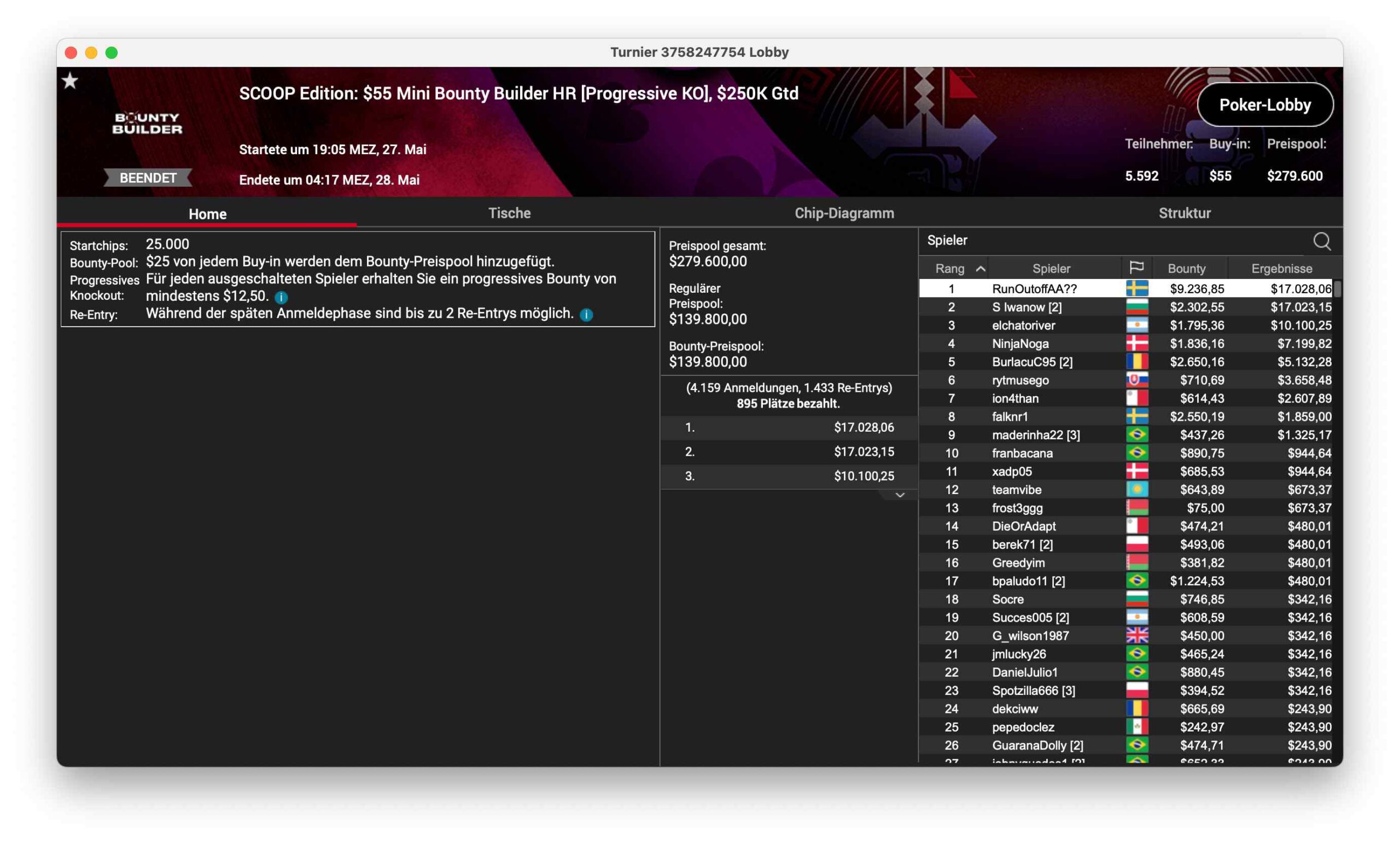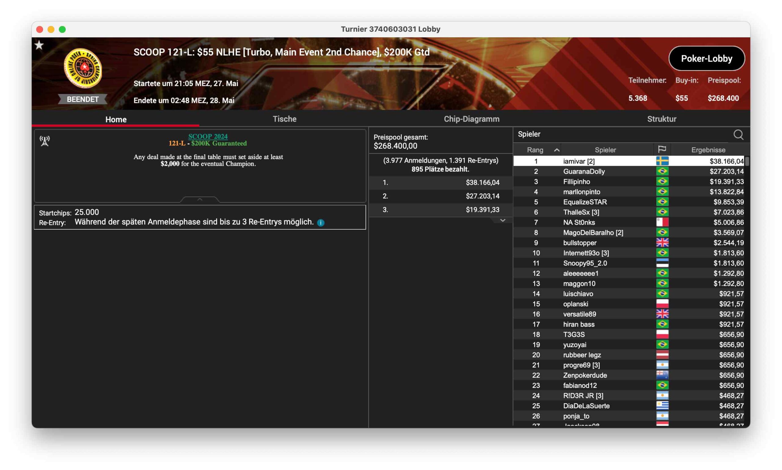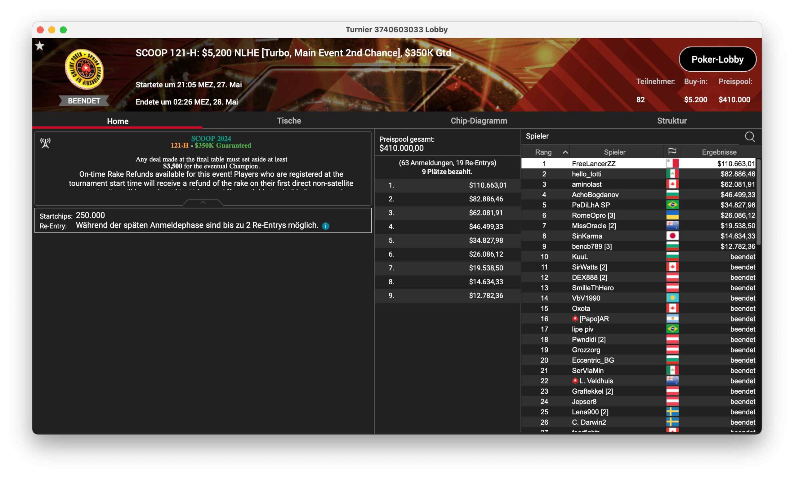 SCOOP 121-M, ein $530 NLHE, Main Event 2nd Chance hatte 699 Runner – $349.500 kamen so im Preispool zusammen. „mohsalah11“ aus Brasilien konnte für $59.499 gewinnen.