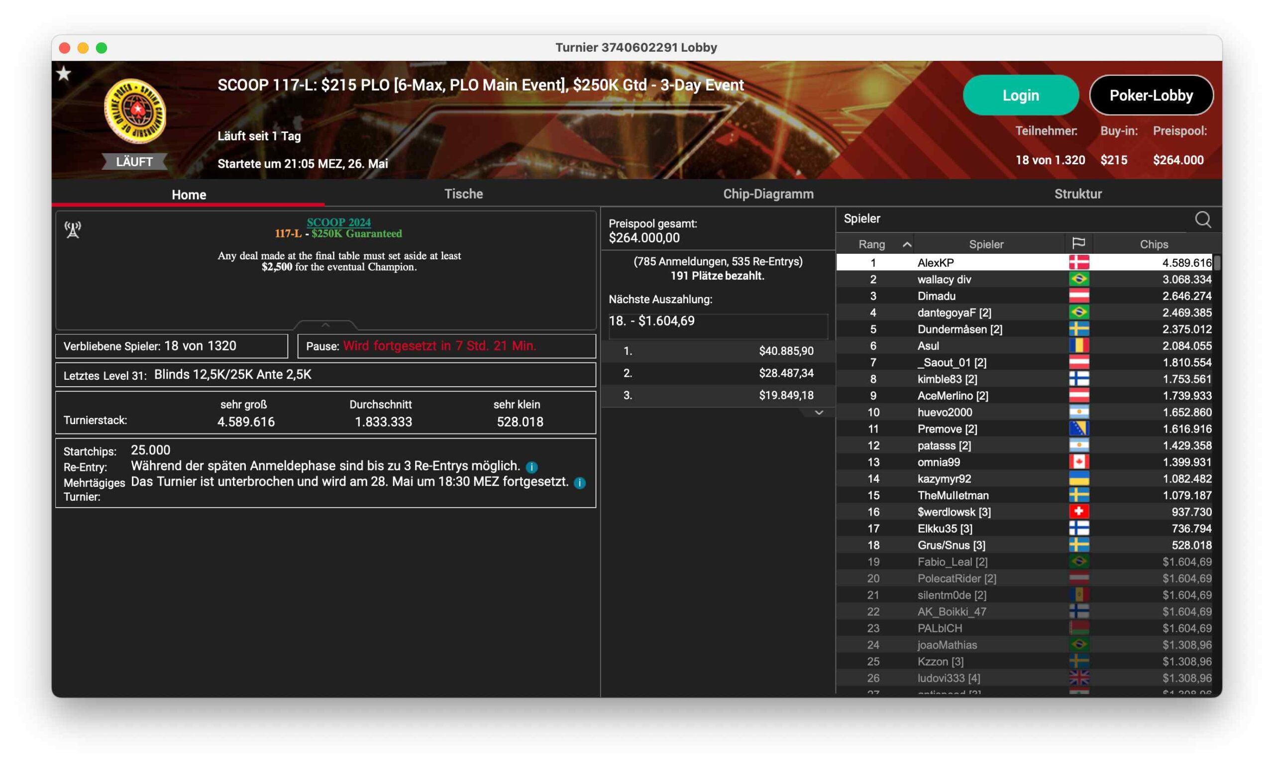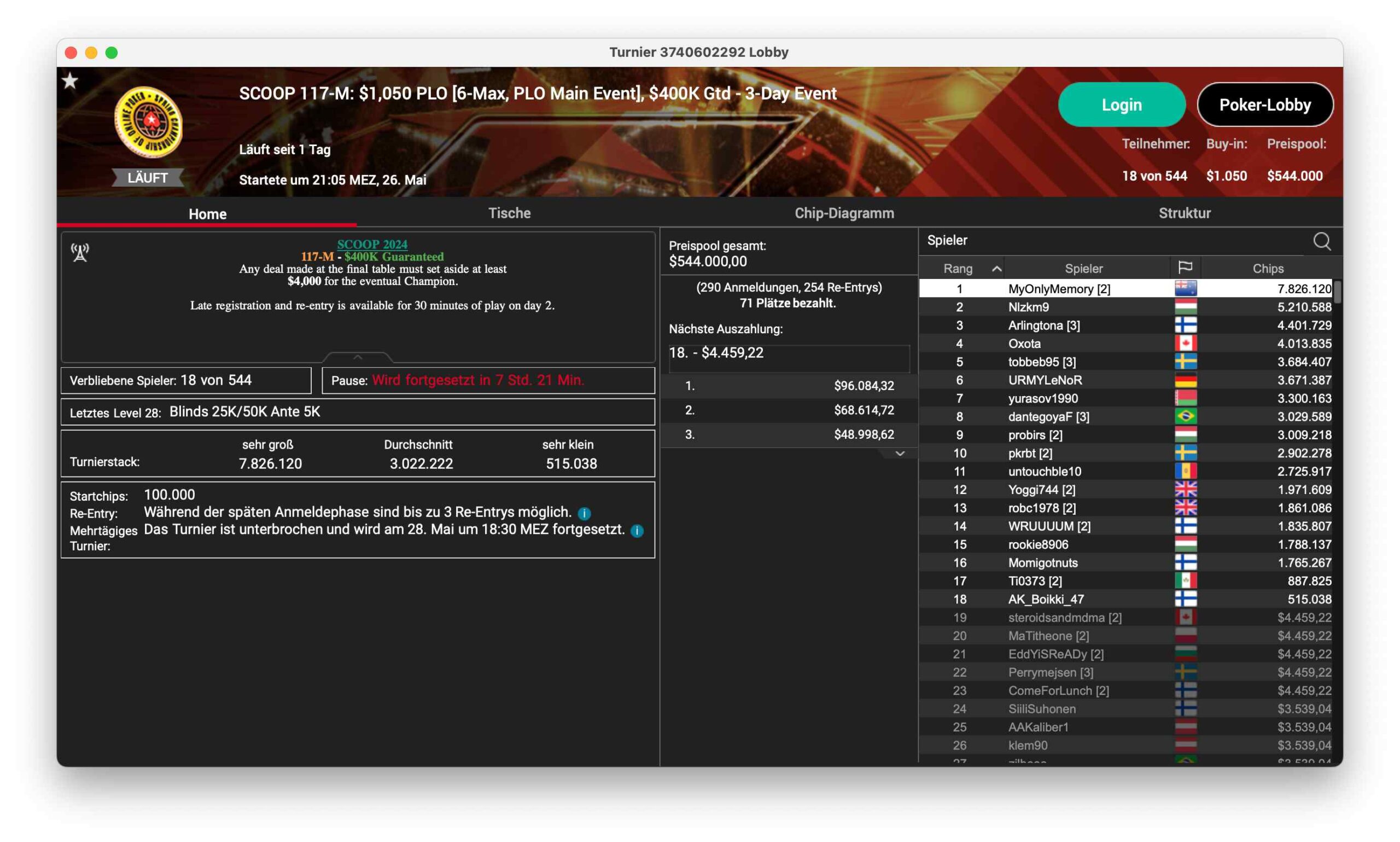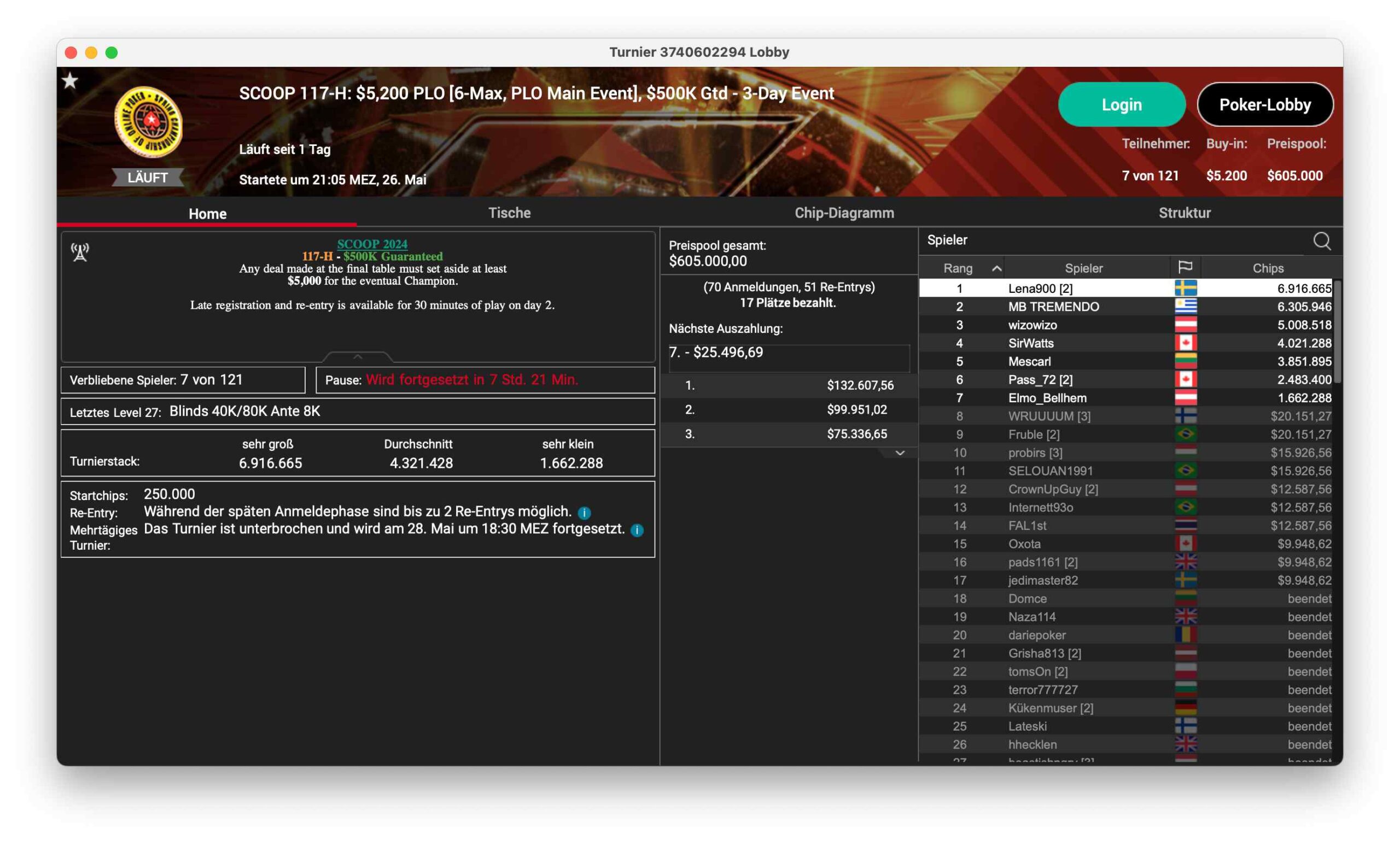 Ein bekannter DACH-Profi steht in guter Position beim SCOOP 117-H, ein $5.200 PLO, das 121 Entries hatte und damit $605.000 ansammelte. Sieben Spieler sind noch im Rennen, Niklas „Lena900“ Astedt steht mit 6,9 Mio. Chips dem Feld vor. Ole „wizowizo“ Schemion sitzt mit 5 Mio. Chips in guter Position.