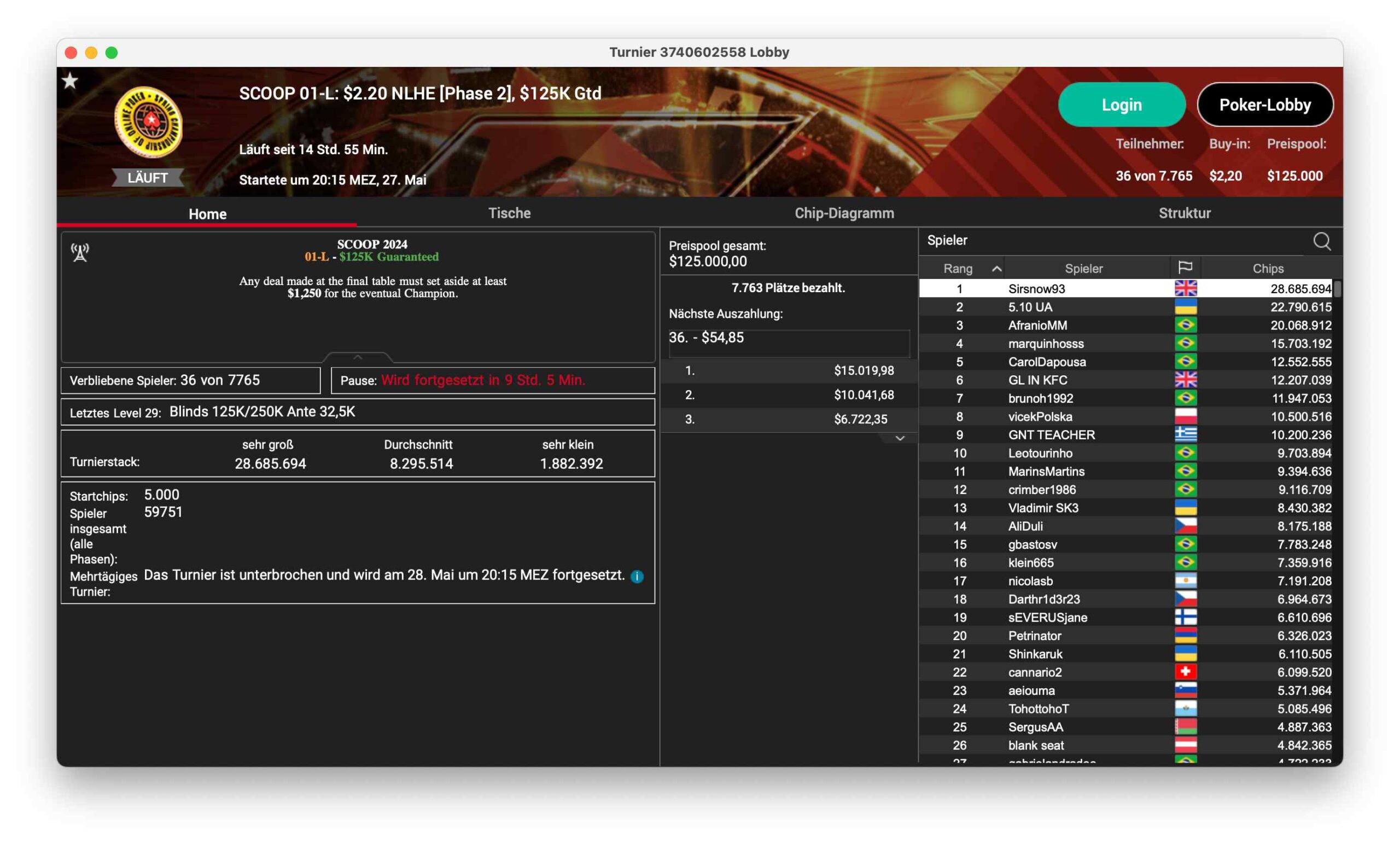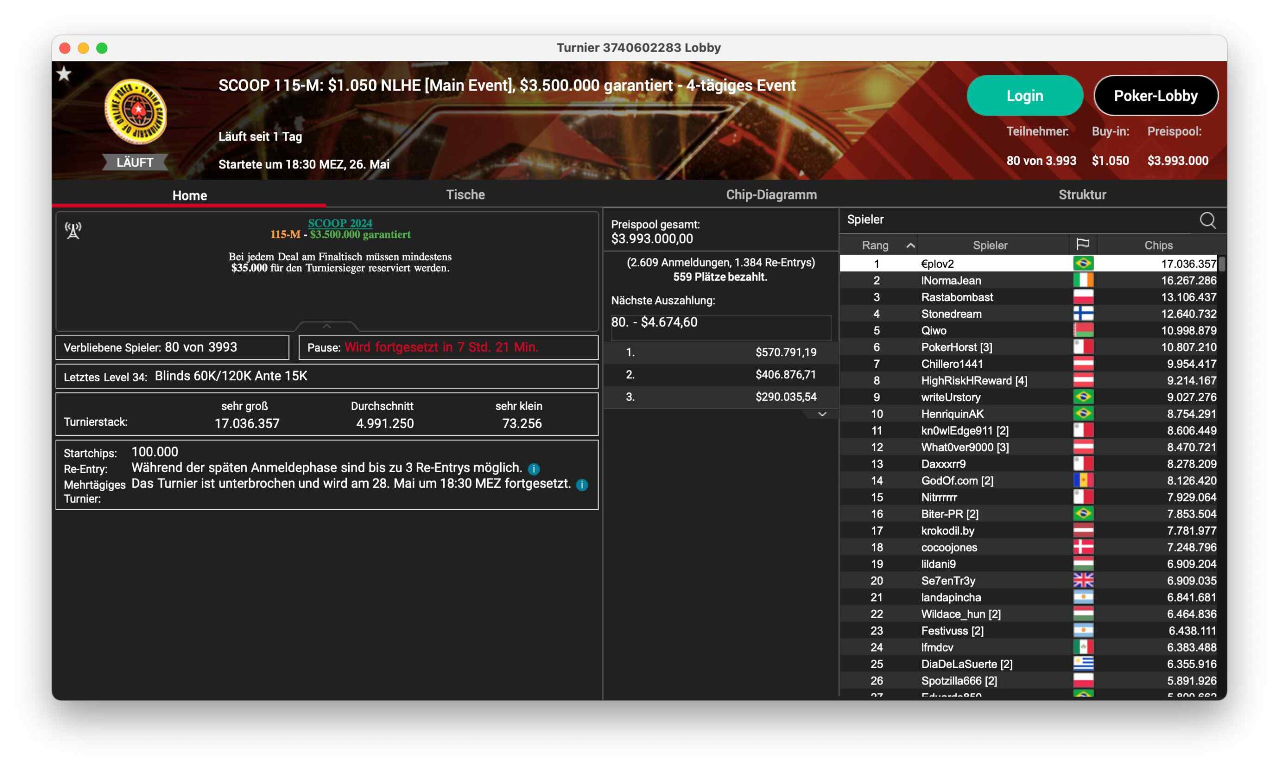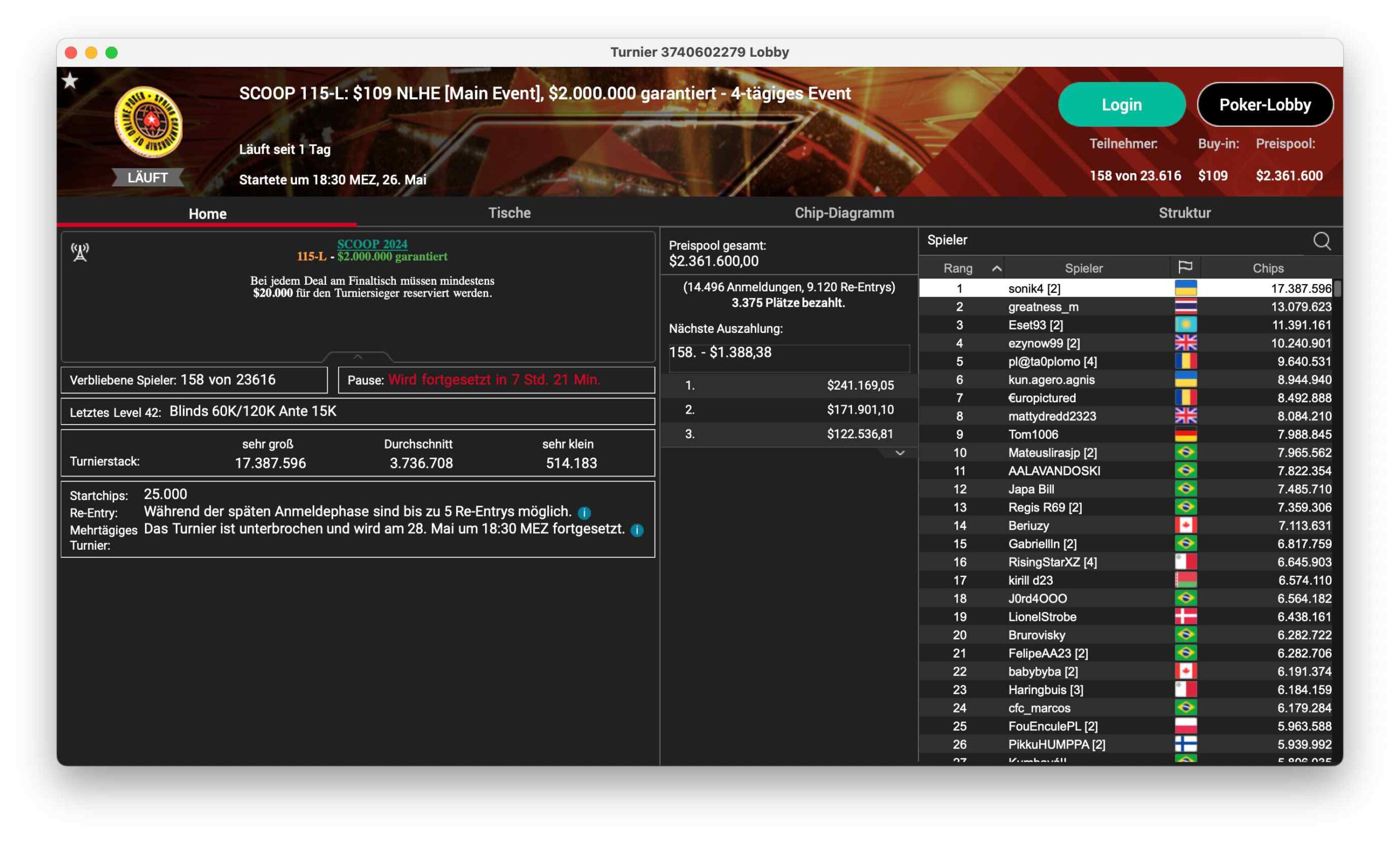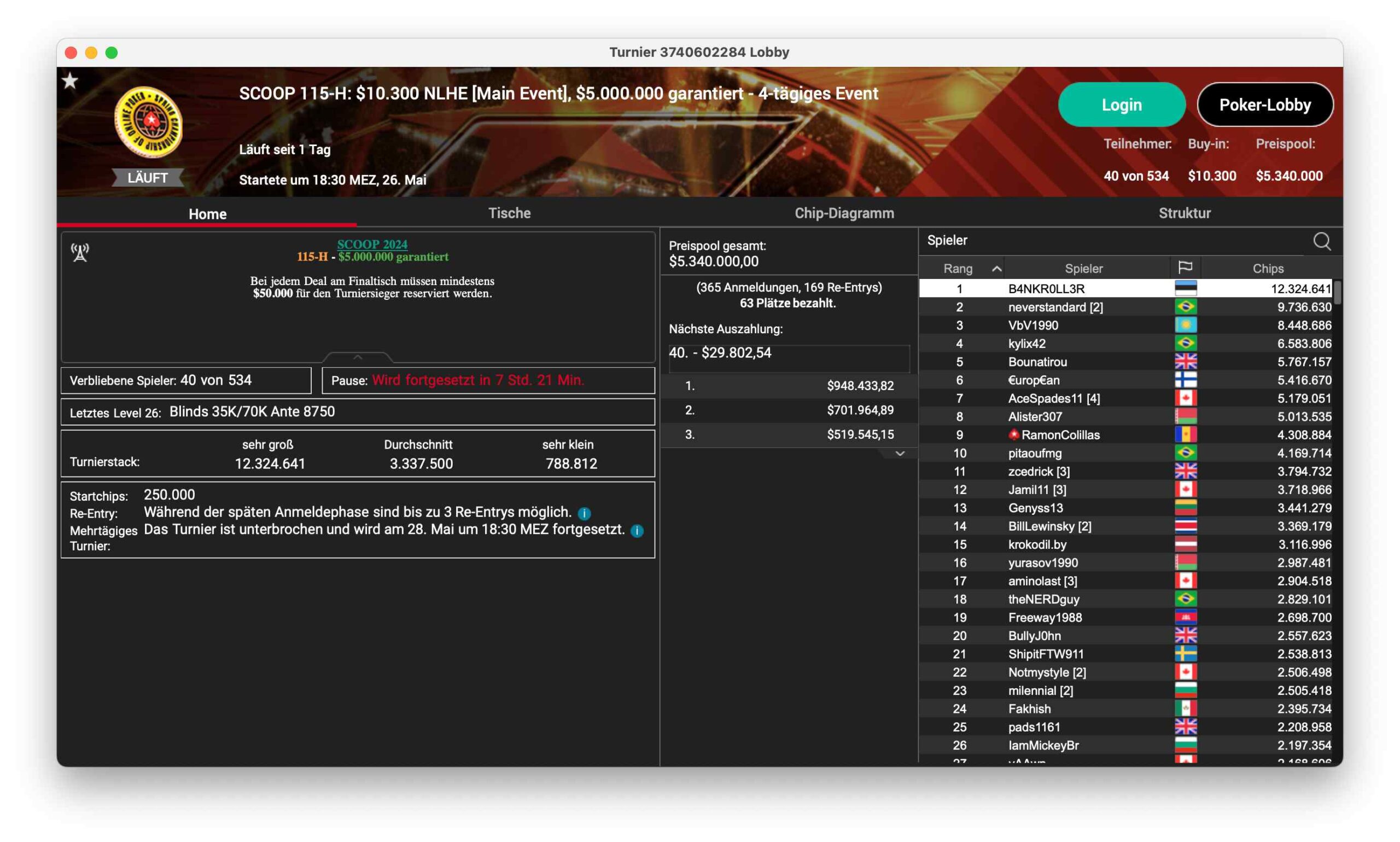 Ein bekannter DACH-Profi steht in guter Position beim SCOOP 117-H, ein $5.200 PLO, das 121 Entries hatte und damit $605.000 ansammelte. Sieben Spieler sind noch im Rennen, Niklas „Lena900“ Astedt steht mit 6,9 Mio. Chips dem Feld vor. Ole „wizowizo“ Schemion sitzt mit 5 Mio. Chips in guter Position.