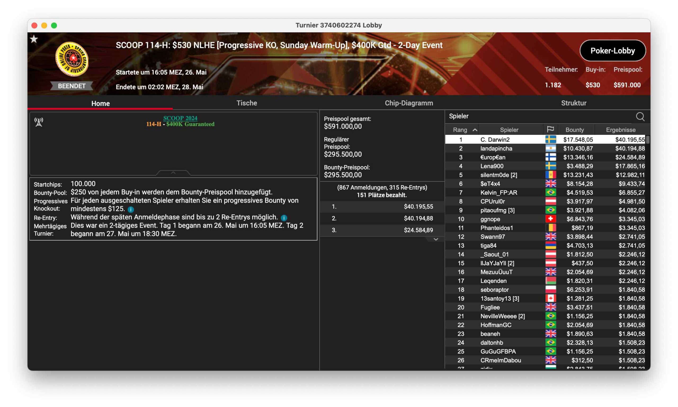 Simon „C. Darwin2“ Mattsson konnte das SCOOP 114-H, ein $530 NLHE, mit 1.182 Entries und $591.000 Preispool gewinnen. Der Sieg brachte ihm $17.548 + $40.195. Samuel „€urop€an“ Vousden wurde Dritter für €13.346 + $24.584. Niklas „Lena900“ Astedt Vierter für $3.488 + $17.865.
