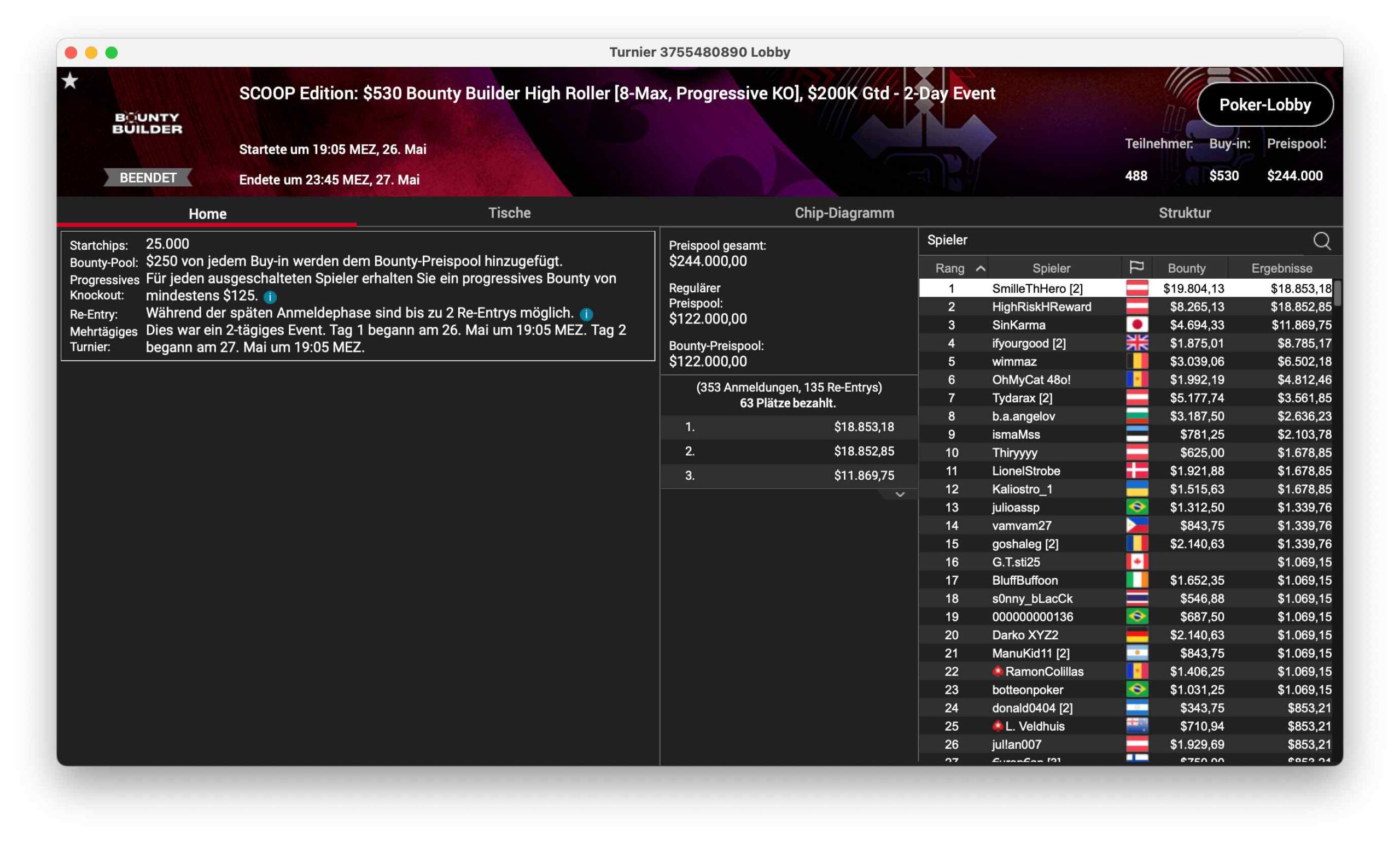 Die SCOOP-Edition des $530 Bounty Builder HR ging an Daniel „SmilleThHero“ Smiljkovic. 488 Entries summierten hier $244.000 Preispool an. Der Sieg war mit $19.804 + $18.853 dotiert.