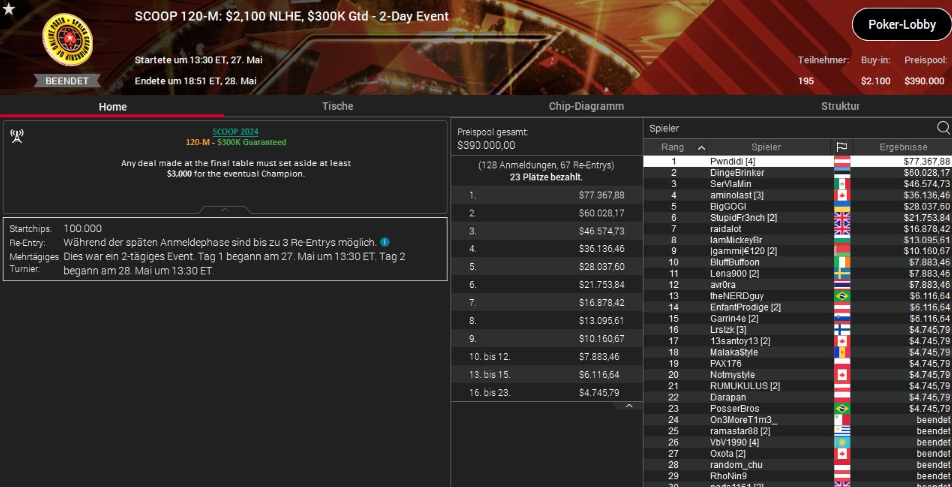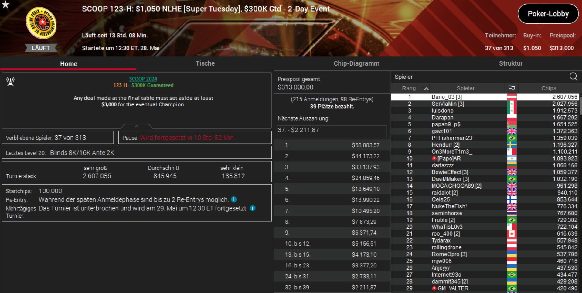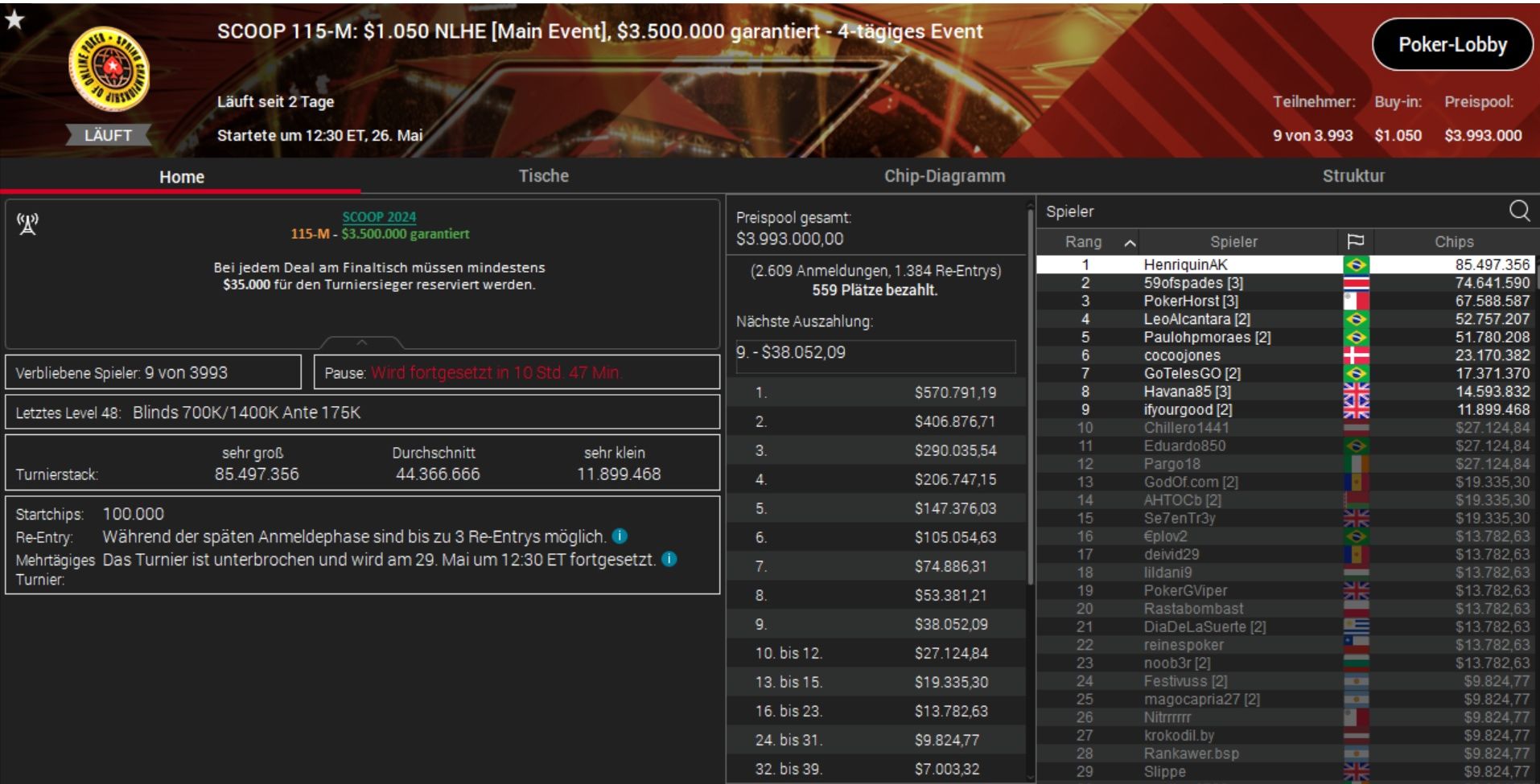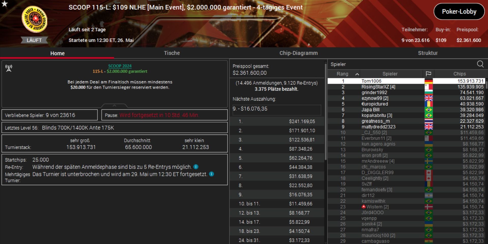 Dafür führt beim kleinen Main Event mit $109 der deutsche Spieler „Tom1006“ und darf sich Hoffnungen auf die Siegprämie von über $241.000 machen.