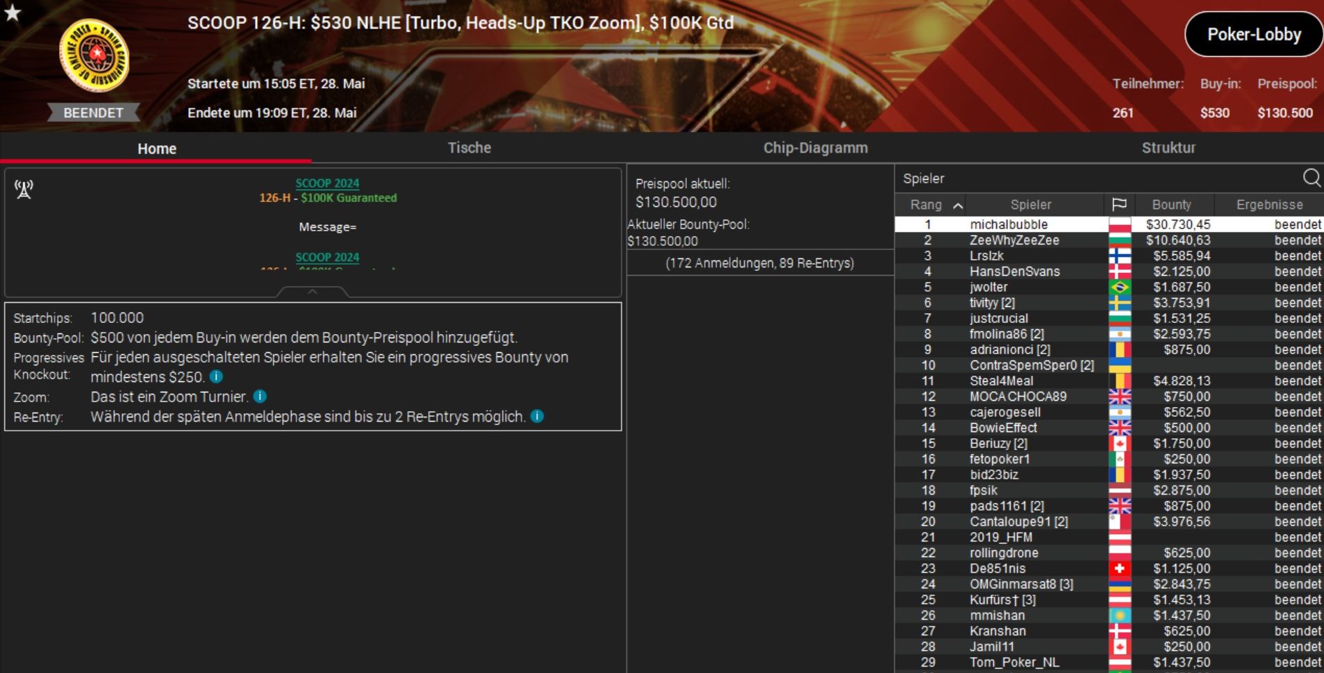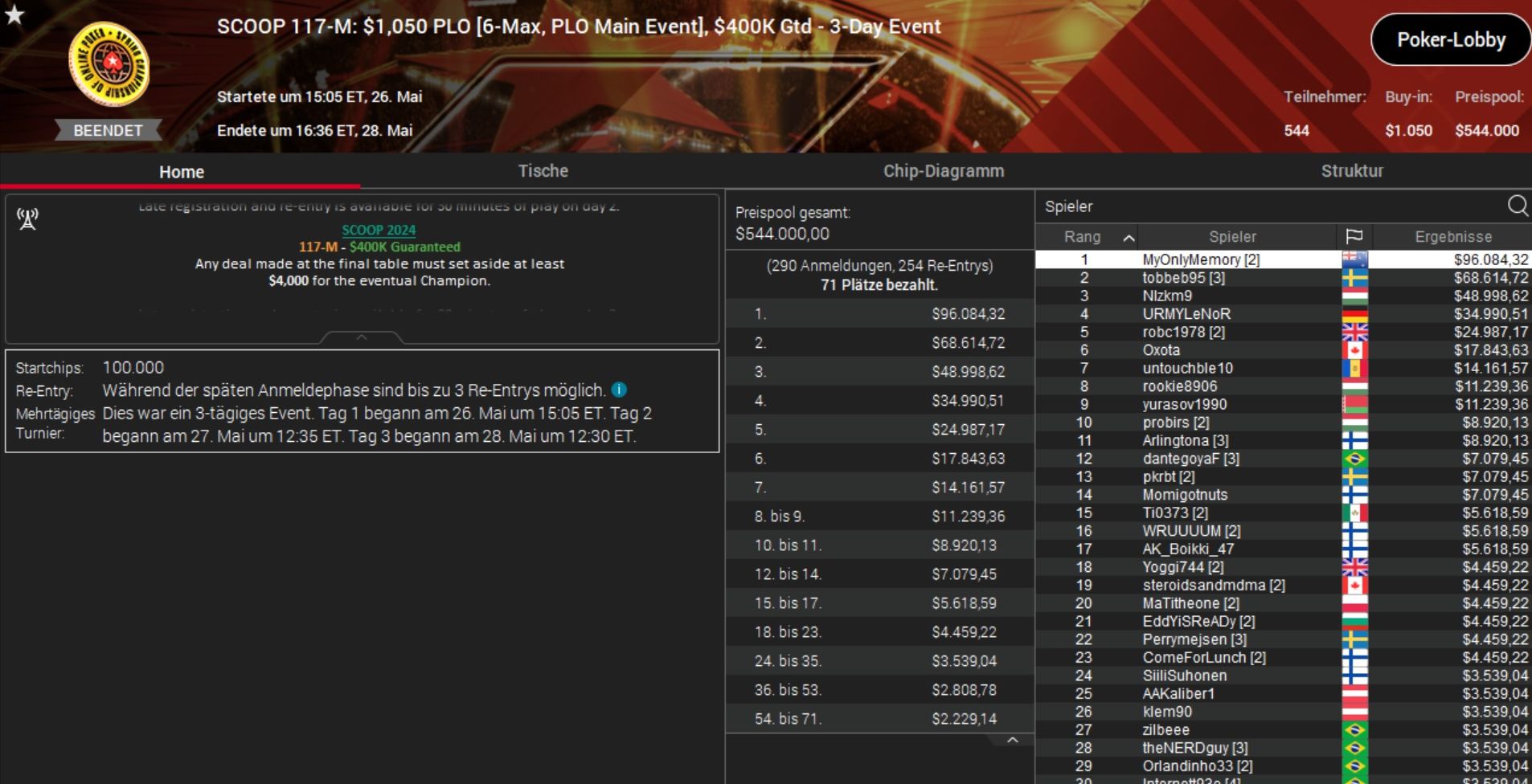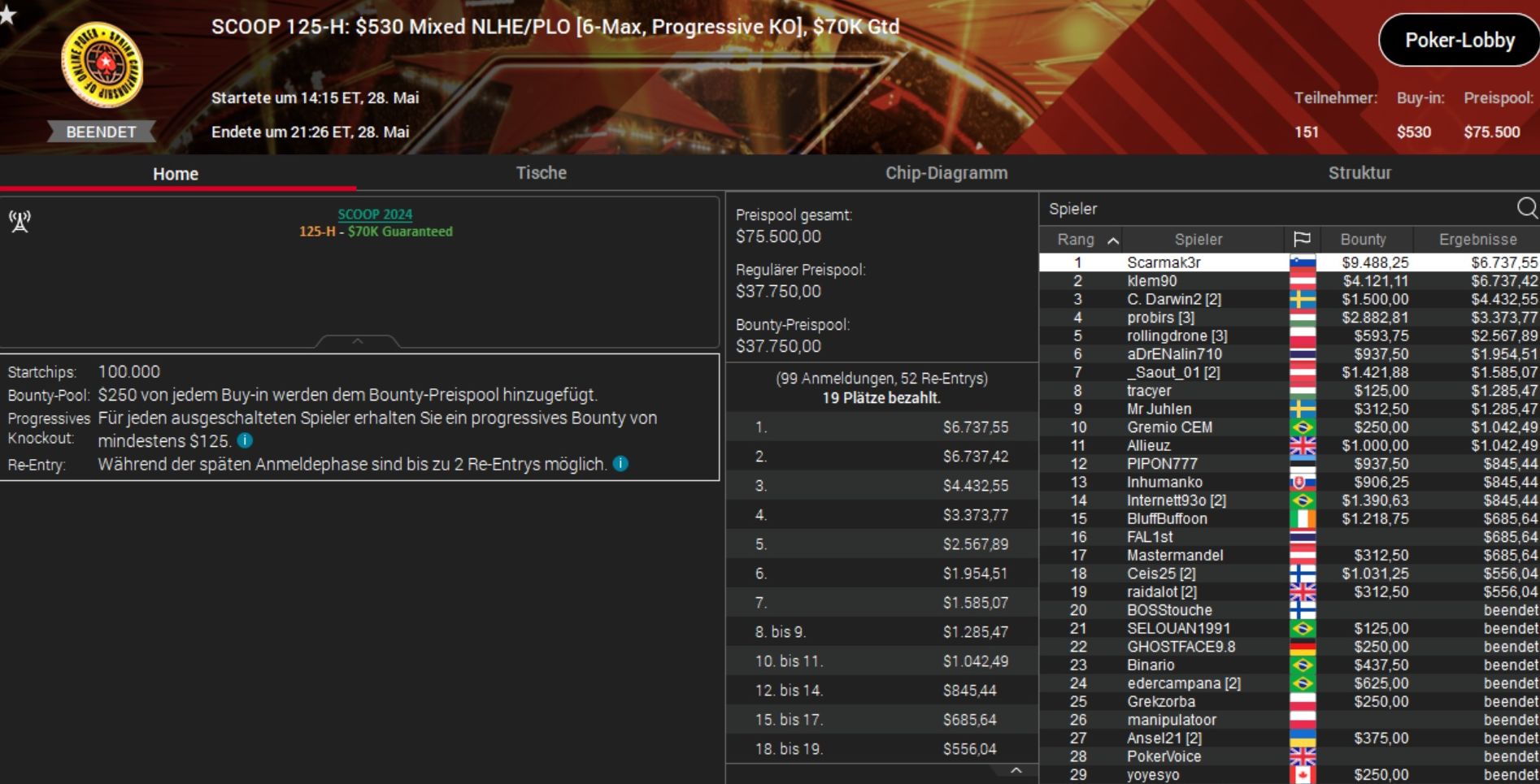 Bei den kleineren SCOOP-Turnieren holte die DACH-Fraktion dann noch zwei Podestplätze. Klemens „klem90“ Roiter wurde beim $530 Mixed NLH/PLO (SCOOP Event 125-H) Zweiter und gewann rund $11.000 Preisgeld, während „HardiZ1“ beim $530 NLH (SCOOP Event 124-H) Rang 3 belegte und rund $20.000 cashte.