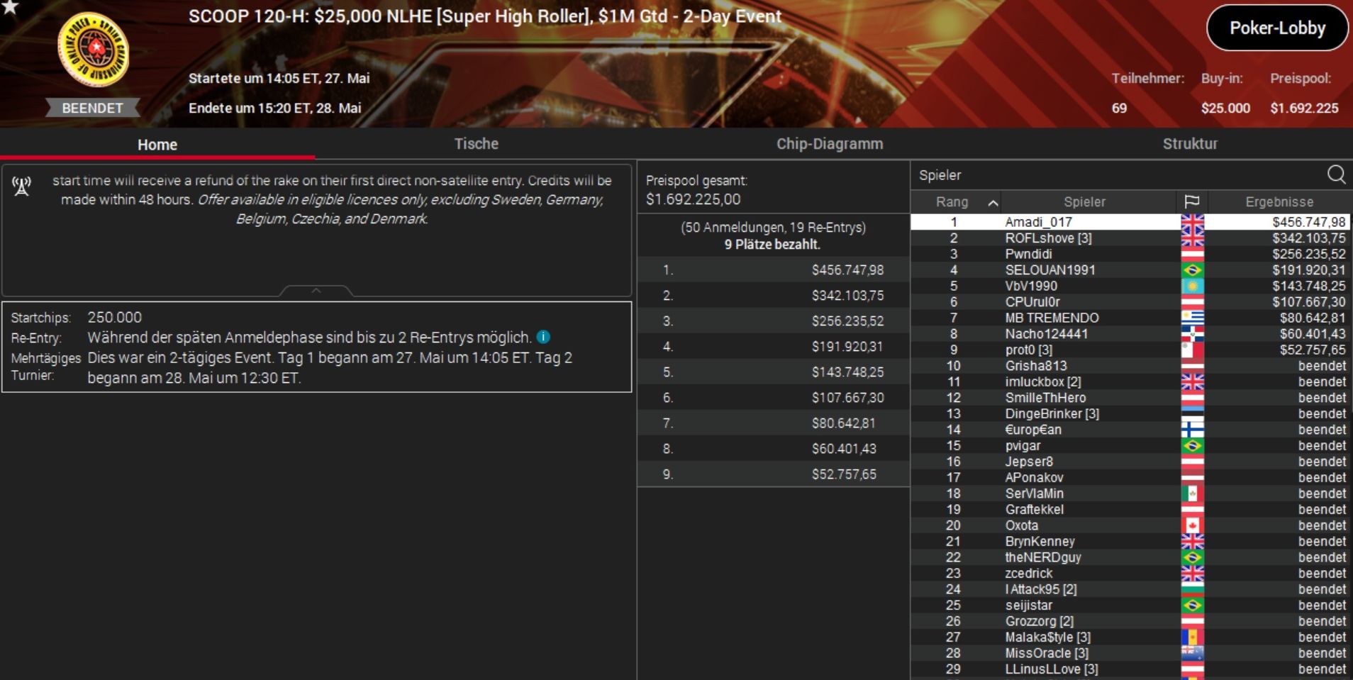 Großer Sieger bei den gestern entschiedenen Turnieren war der Spanier Adrian „Amadi_017“ Mateos, der sich beim 25k (SCOOP Event 120-H) durchsetzte und über $456.000 einstrich.