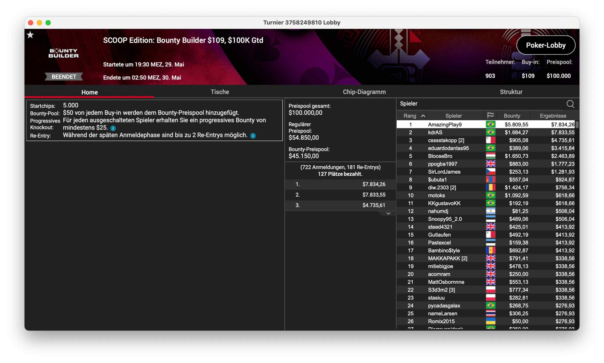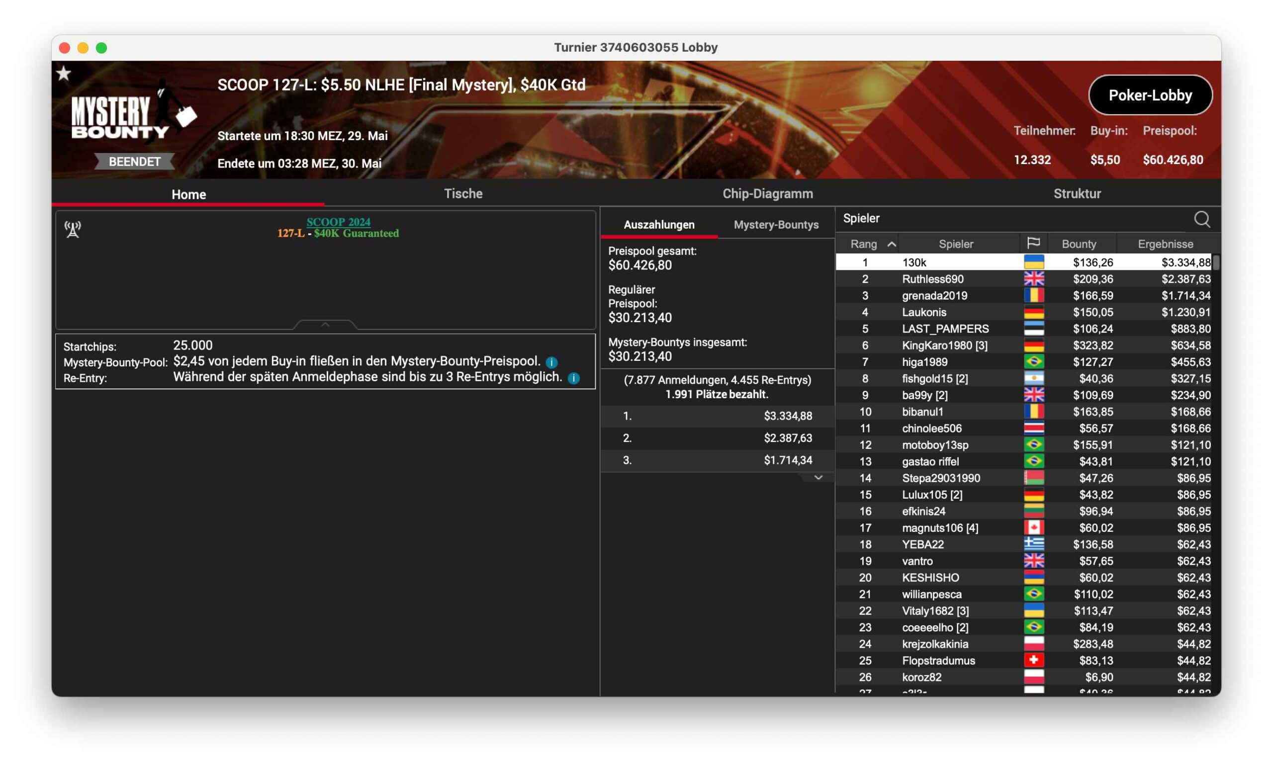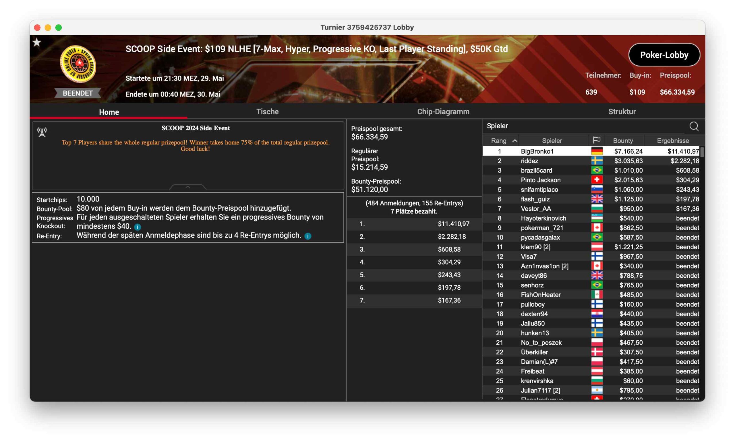 Der deutsche Spieler „BigBronko1“ gewann das SCOOP-Side, $109 NLHE 7max Hyper KO, mit 639 Entries und $66.334 Preispool. Der Sieg brachte $7.166 + $11.410.