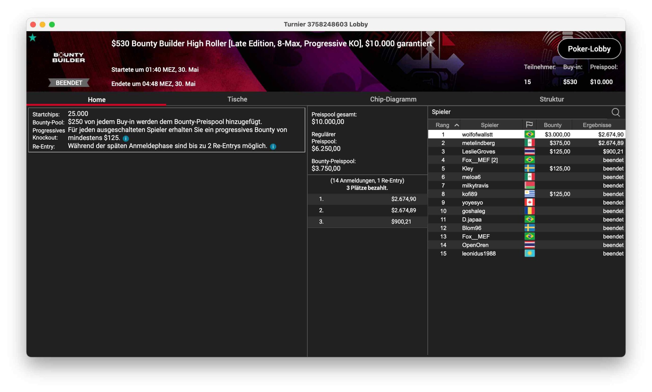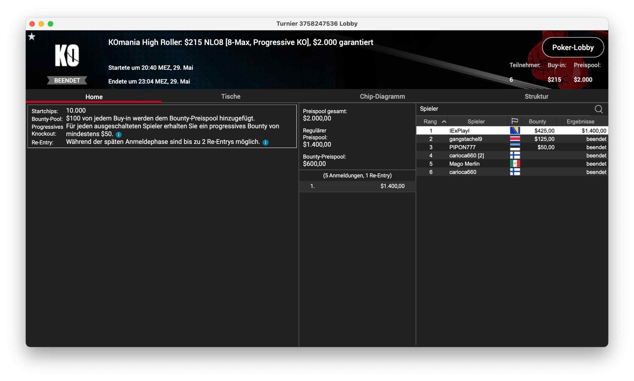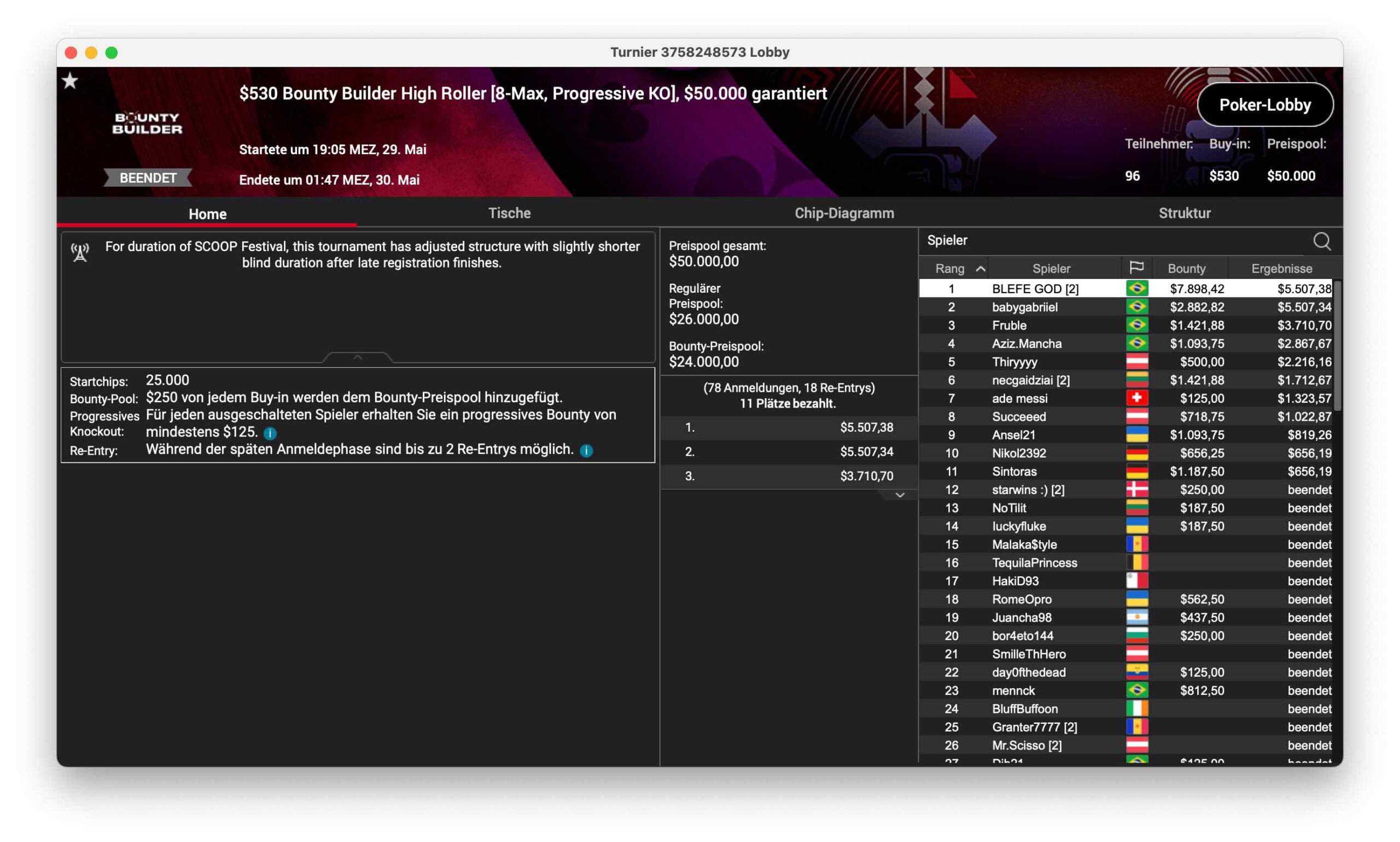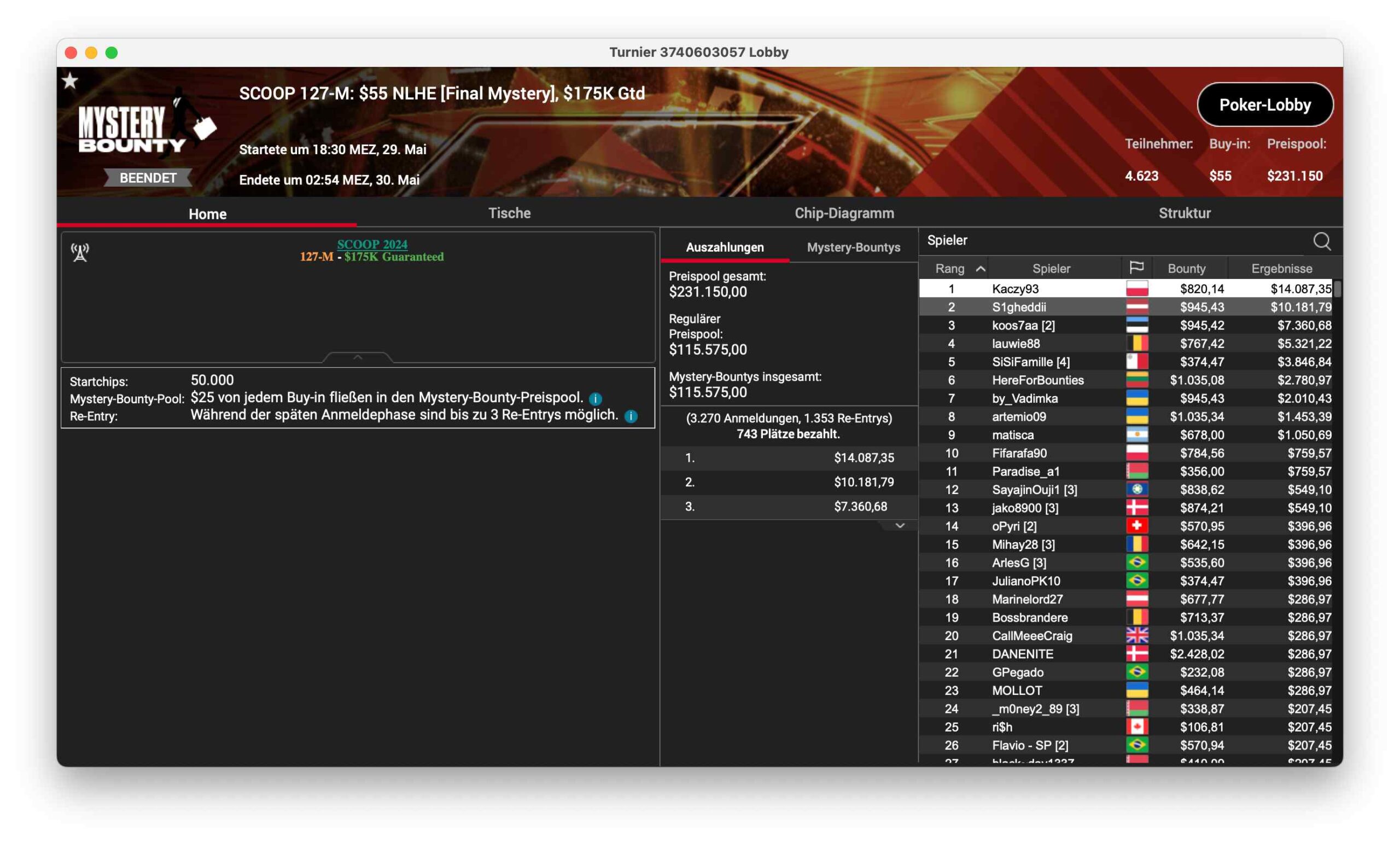 Der deutsche Spieler „BigBronko1“ gewann das SCOOP-Side, $109 NLHE 7max Hyper KO, mit 639 Entries und $66.334 Preispool. Der Sieg brachte $7.166 + $11.410.