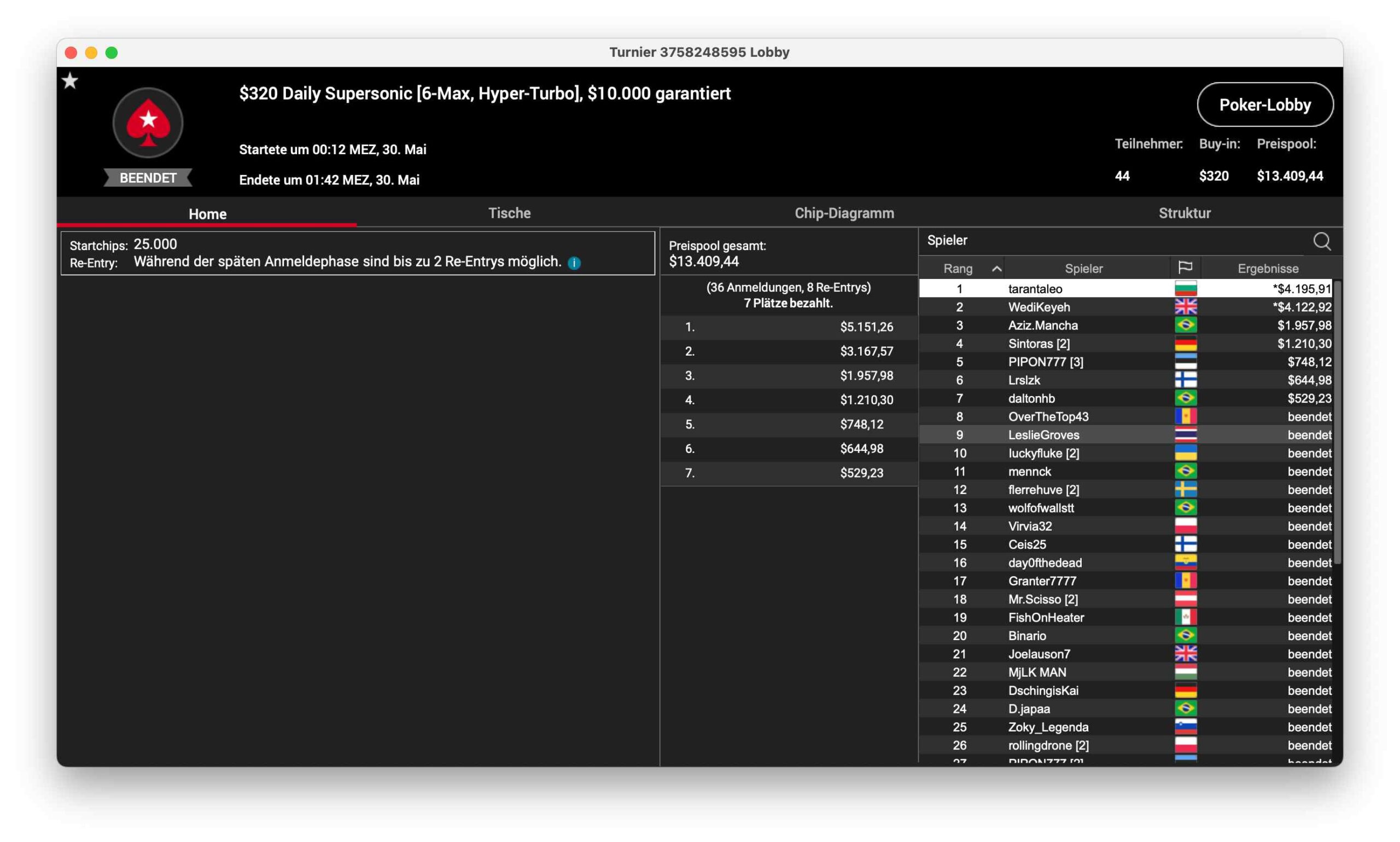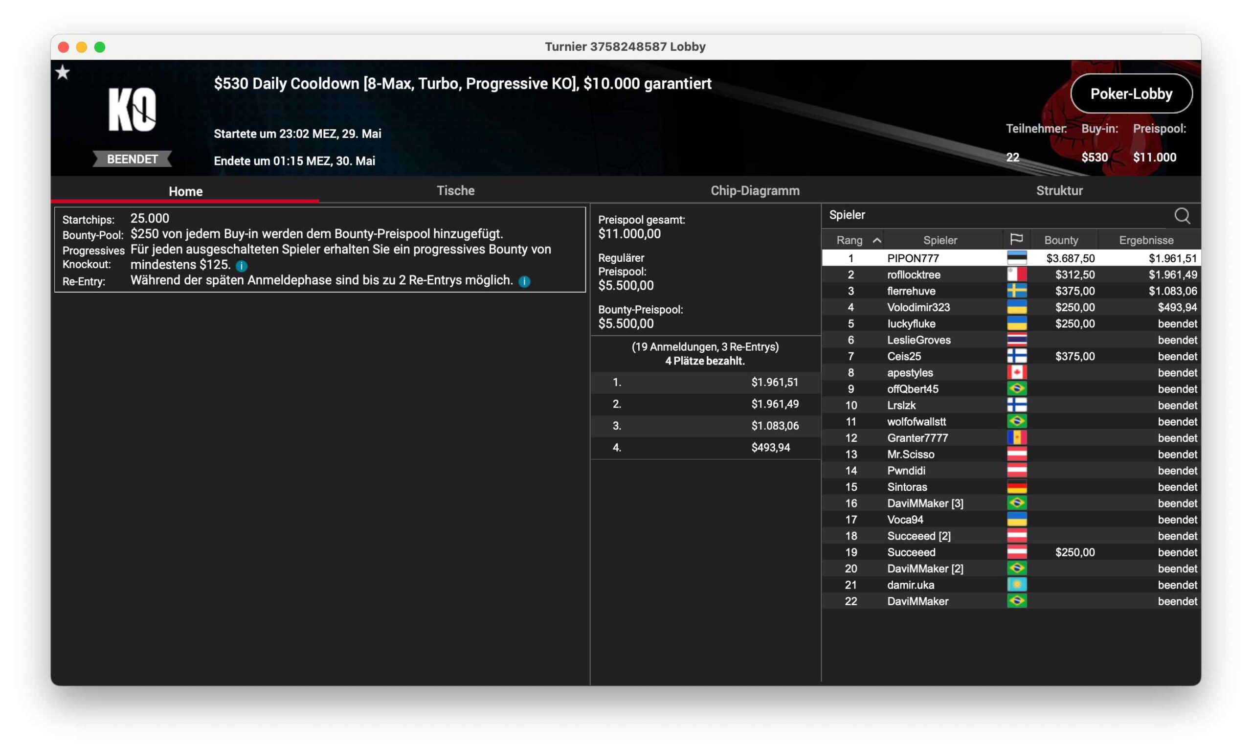 PokerStars-Stammgast „PIPON777“ aus Estland gewann bei den High Rollern das 22-Entry starke $530 Daily Cooldown mit $11.000 Preispool. Platz 1 wurde mit $3.687 + $1.961 belohnt.