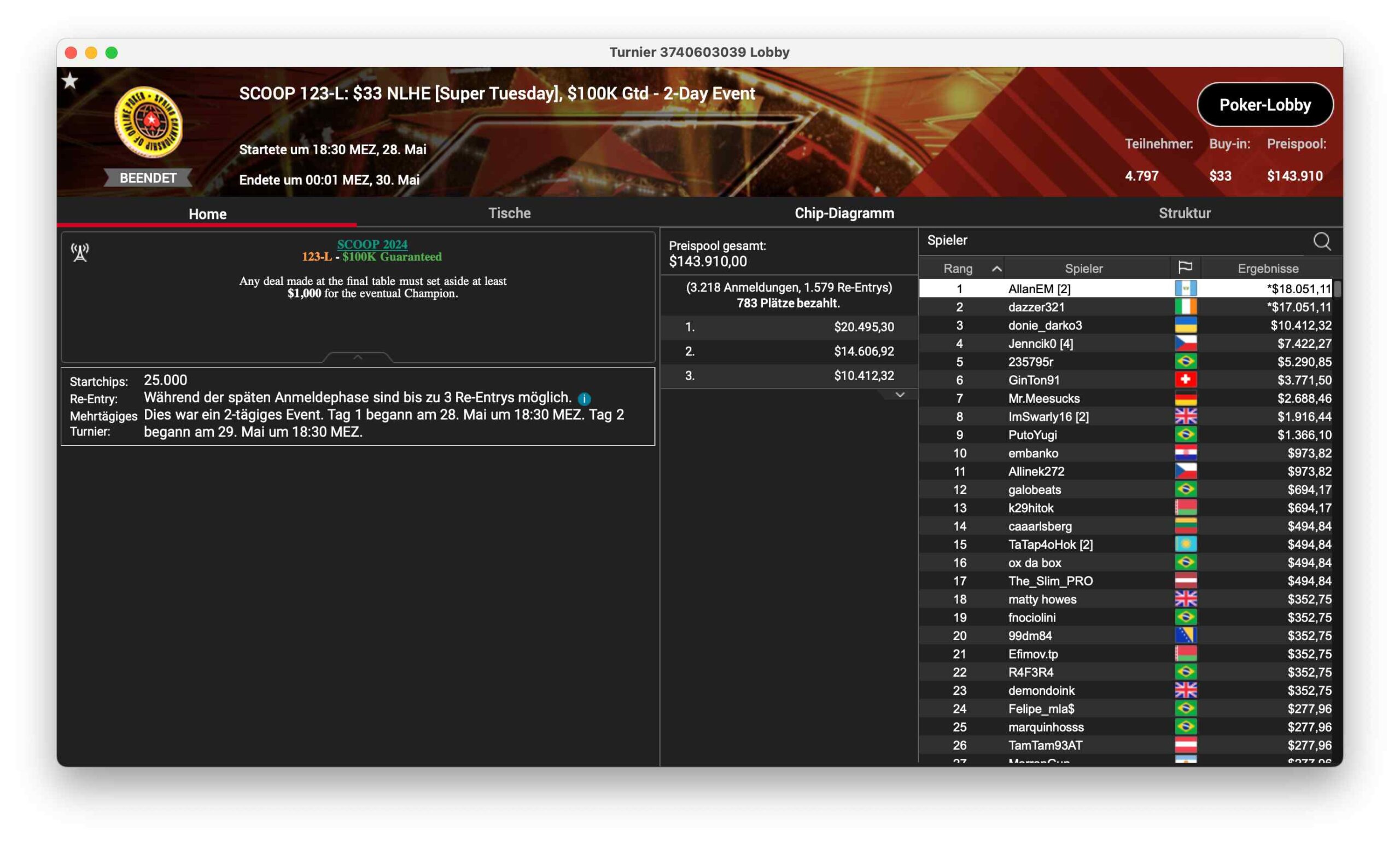 Niclas „Flushiisback“ Thumm verpasste SCOOP-Gold knapp. Er wurde beim SCOOP 128-H mit 306 Entries Runner-Up für $5.216 + $8.790. Der Finne „babecallme“ triumphierte für $9.194 + $8.790.