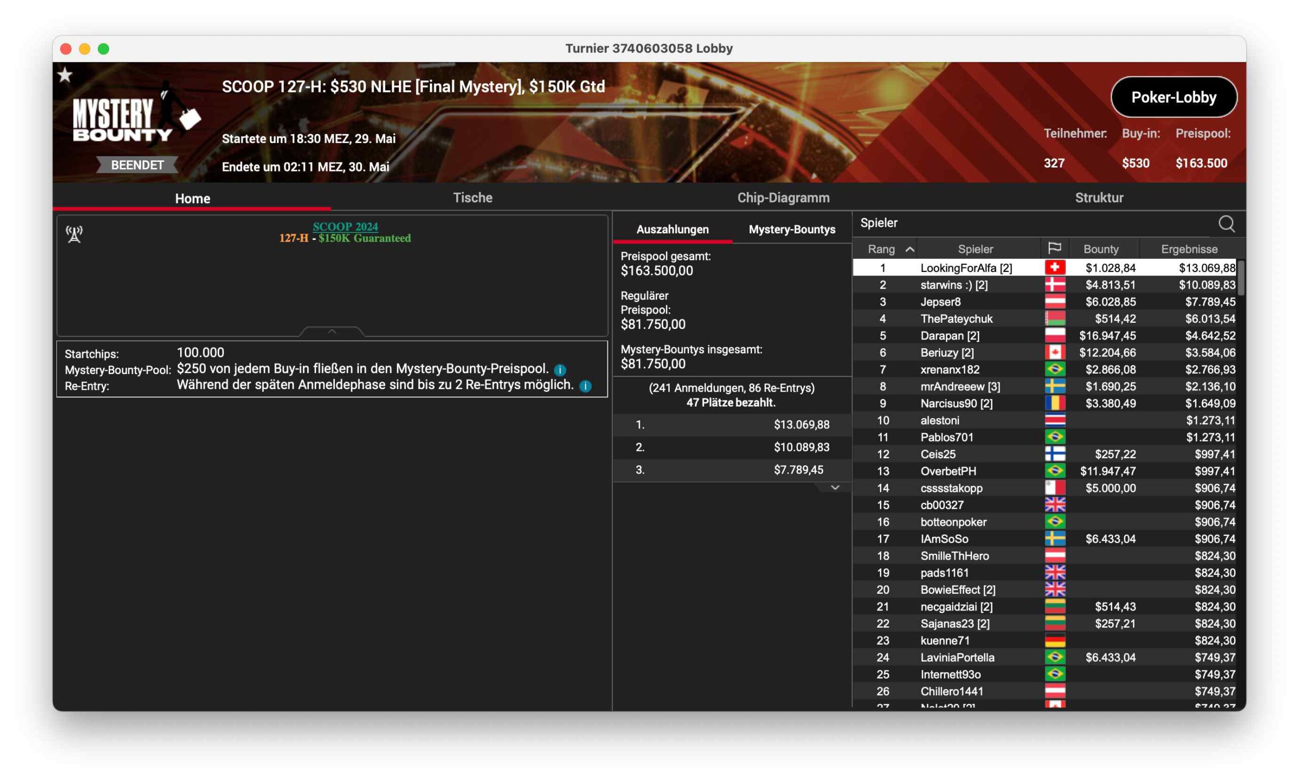 Ein Schweizer konnte sich das $530 NLHE, SCOOP 127-H Final Mystery, mit 327 Entries und $163.500 Preispool schnappen. „LookingForAlfa“ gewann das $1.028 + $13.069. Der Österreicher „Jepser8“ wurde Dritter für $6.028 + $7.789.