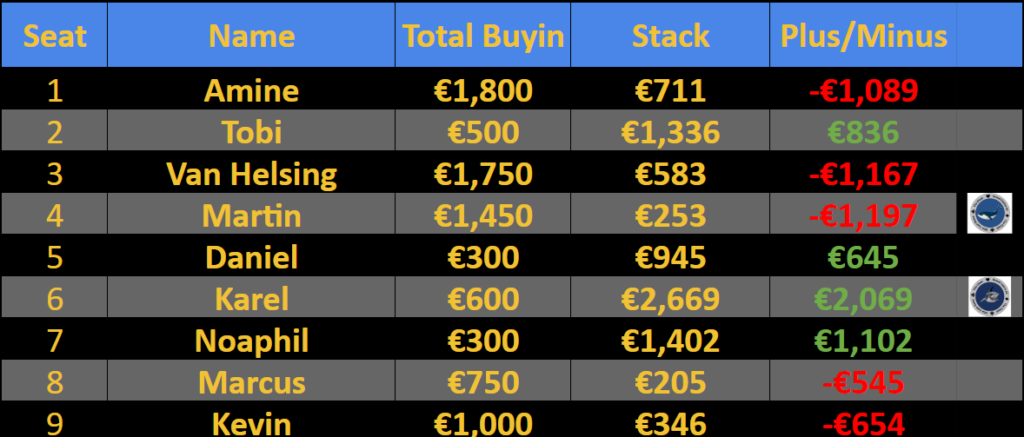 74 Spieler kamen für dieses traditionelle Freitagsturnier zusammen und bezahlten zusätzlich für 29 Re-entries. Dies reichte nicht aus, um die Garantie zu erfüllen, und das Casino musste ein wenig drauflegen. Der €7.000-Preispool wurde auf die elf besten Spieler verteilt und den größten Anteil erhielten Sven Wahlicht und ein Spieler mit dem Spitznamen ‚Abrechner‚ nach einem Heads-up Deal. Beide Spieler aus Deutschland nahmen jeweils €1.725 mit nach Hause.