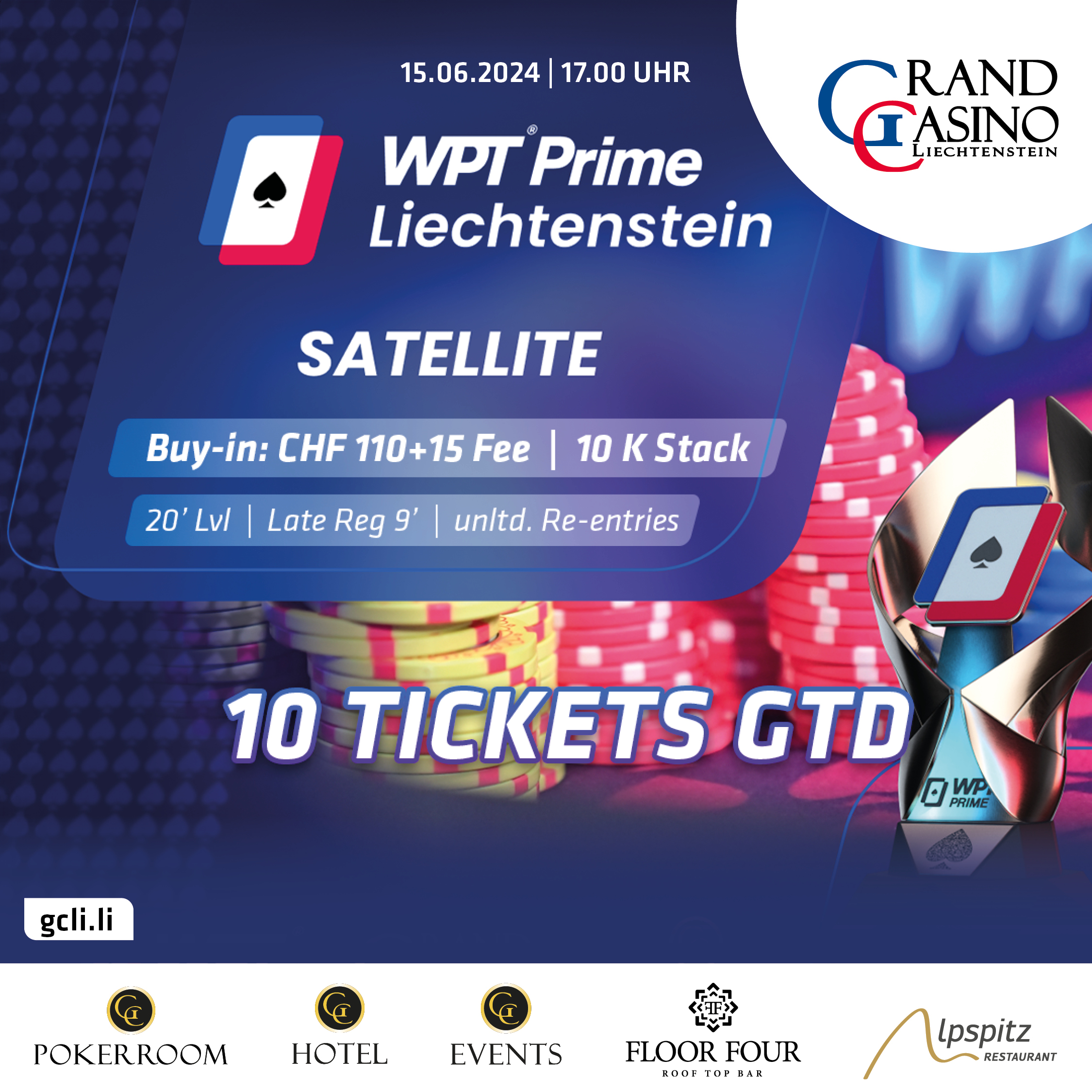 Einen Vorgeschmack auf die WPT Prime Liechtenstein (28. August bis 9. September) bekommen Pokerenthusiast*innen heute ab 17:00 Uhr im GCLi. Beim WPT Prime Satellite liegen bereits 10 Tickets für das WPT Prime Championship Event (5. bis 9. September) garantiert im Preispool, was einem Gegenwert von 11.000 CHF entspricht. Die Blindlevel im heutigen Satellite sind 20 Minuten lang und innerhalb der ersten 9 sind unlimited Re-Entries möglich. Der Starting Stack beträgt 10.000 Chips.