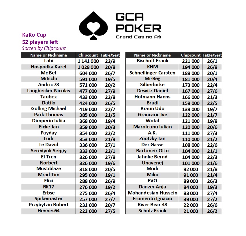 Im €110 Main Event des KannKommen Cup, kurz KaKo Cup, präsentiert vom Pokerclub KannKommen e.V., im Grand Casino Aš (GCA) wurde gestern der Tag 1B gespielt.