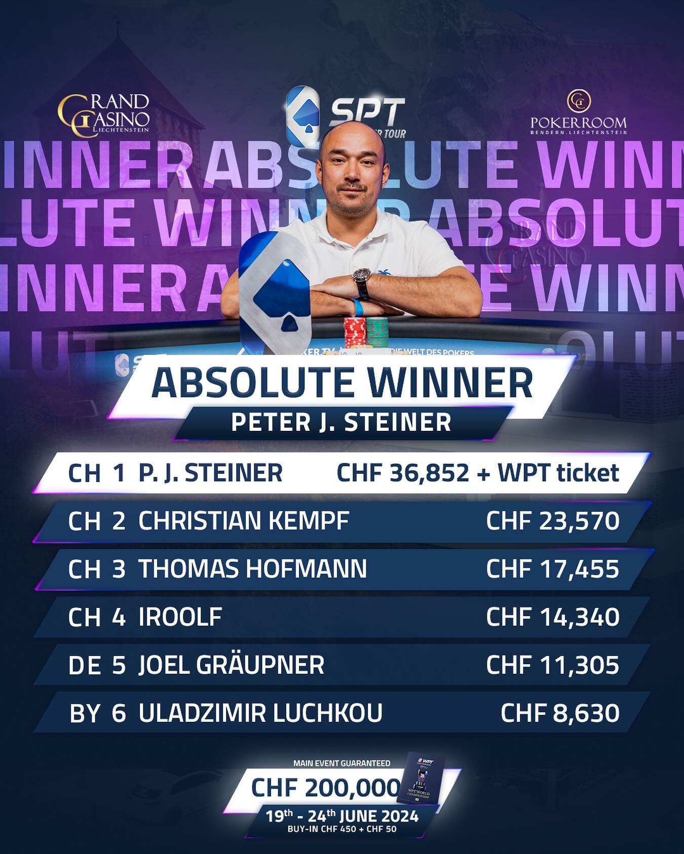 | Peter John | Steiner | CH | CHF 36.852 | & WPT World Champion Ticket | |