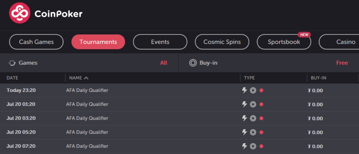 - Die AFA Daily Qualifiers finden dienstags, mittwochs, donnerstags und freitags alle 2 Stunden um 18:20 Uhr, 20:20 Uhr, 22:20 Uhr, 00:20 Uhr, 02:20 Uhr statt (alle Zeiten MEZ/GMT+2). Die Turniere sind offen für Teilnehmer aus allen Ländern, da CoinPoker ohne KYC für Spieler aus der ganzen Welt verfügbar ist.