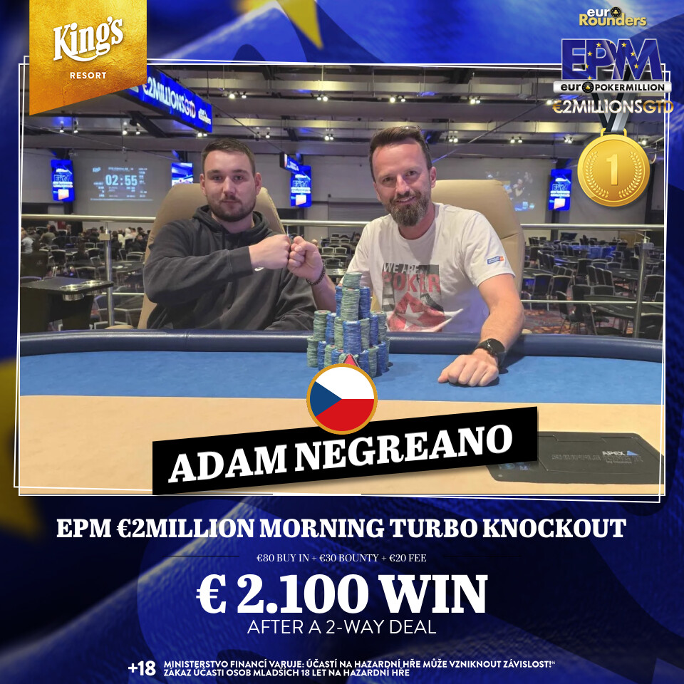 13 Spieler bekamen einen Anteil davon ab und das größte Stück des Preispool-Kuchens ging nach einem Heads-up Deal an den Tschechen mit dem Spitznamen ‚Adam Negreano‘. Dieser erhielt €2.100 für seinen ersten Platz.