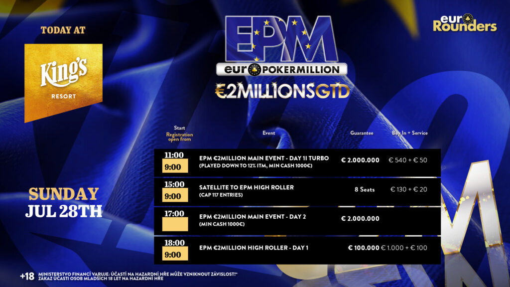 Heute geht es um 11:00 Uhr im King’s Casino Rozvadov weiter mit dem letzten Starttag für das €590 EPM €2Million Main Event (1I). Der Tag 2 startet dann um 17:00 Uhr. Außerdem steht um 18:00 Uhr noch ein €1.100 EPM €2Million High Roller Event mit einer €100.000 Garantie auf dem Programm.