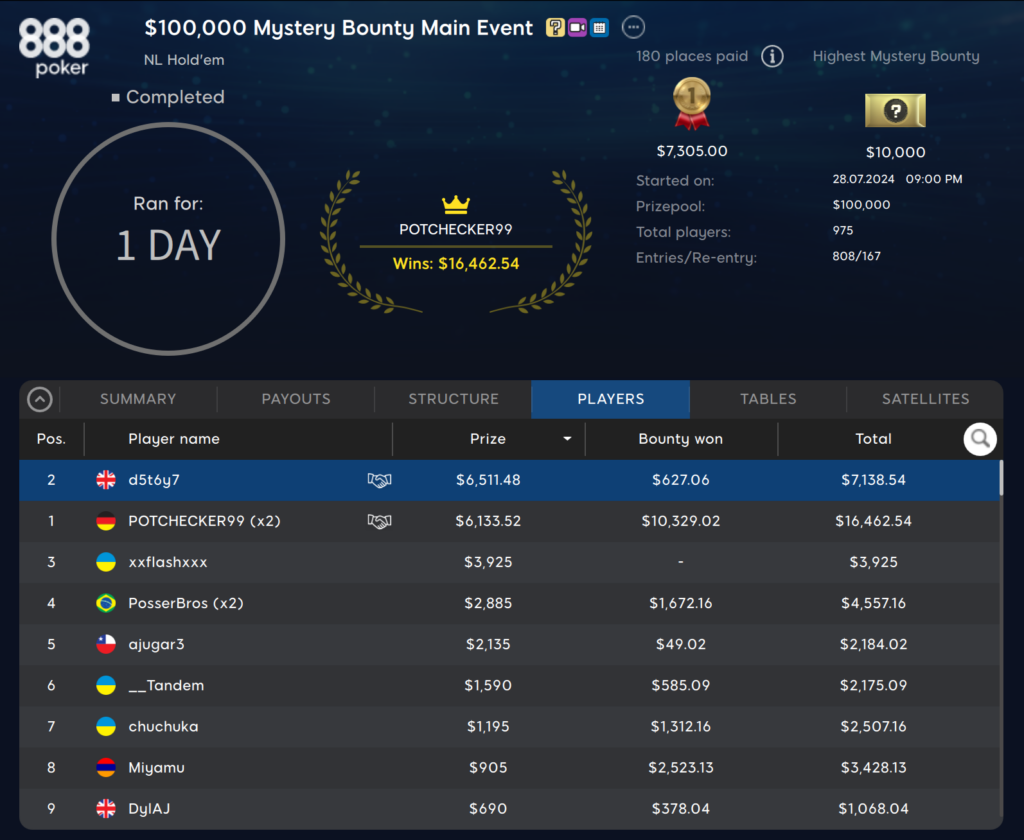 Aber kommen wir zum Highlight, dem $109 Mystery Bounty Main Event. Die kräftige Garantie von $100.000 wurde mit 975 knapp verfehlt. Im Heads-up kam es zu einem Deal zwischen dem deutschen Spieler ‚POTCHECKER99‚ und dem britischen Spieler ‚d5t6y7‚. Letzterer wurde schließlich offiziell als Sieger gekrönt und erhielt dafür $627 und $7.138 an Bounties.