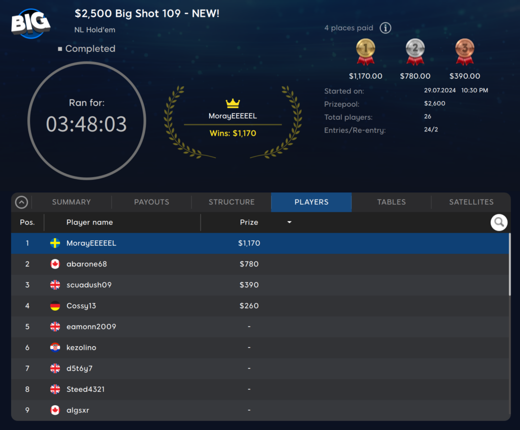 Das $109 Big Shot hatte eine $2.500 Garantie, welche mit 26 Entries knapp übertroffen werden konnte. Der $2.600 Preispool wurde auf vier Spieler verteilt und den größten Anteil erhielt der Schwede ‚MorayEEEEEL‚ mit $1.170.