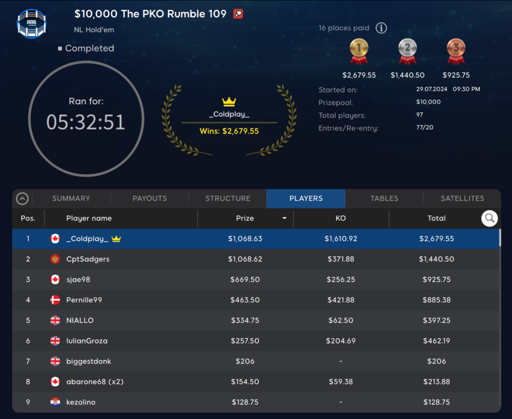 Als nächstes haben wir das $109 The PKO Rumble. Die Garantie von $10.000 konnte mit 97 Anmeldungen knapp nicht erreicht werden. Als Sieger konnte der Kanadier ‚_Coldplay_‚ hervorgehen und erhielt dafür $1.610 plus $2.679 an Bounties.